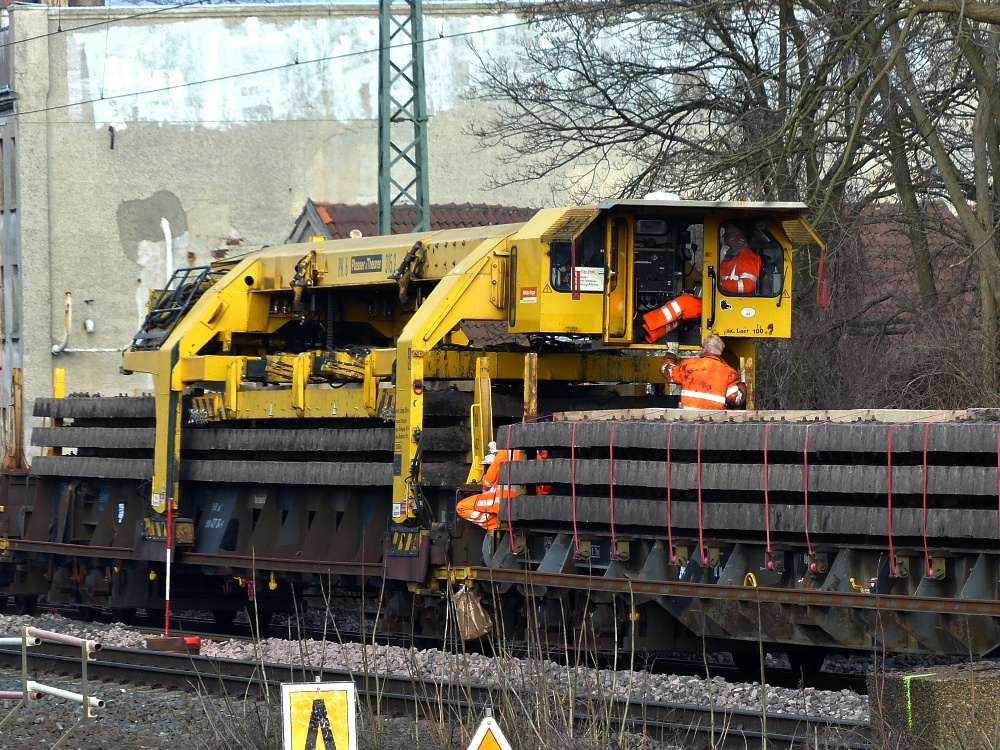 Der rechts zu sehende Portalkran hat gerade eine Lage Neuschwellen