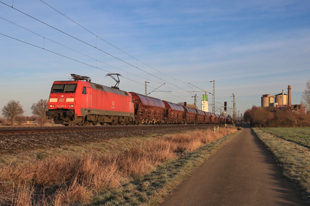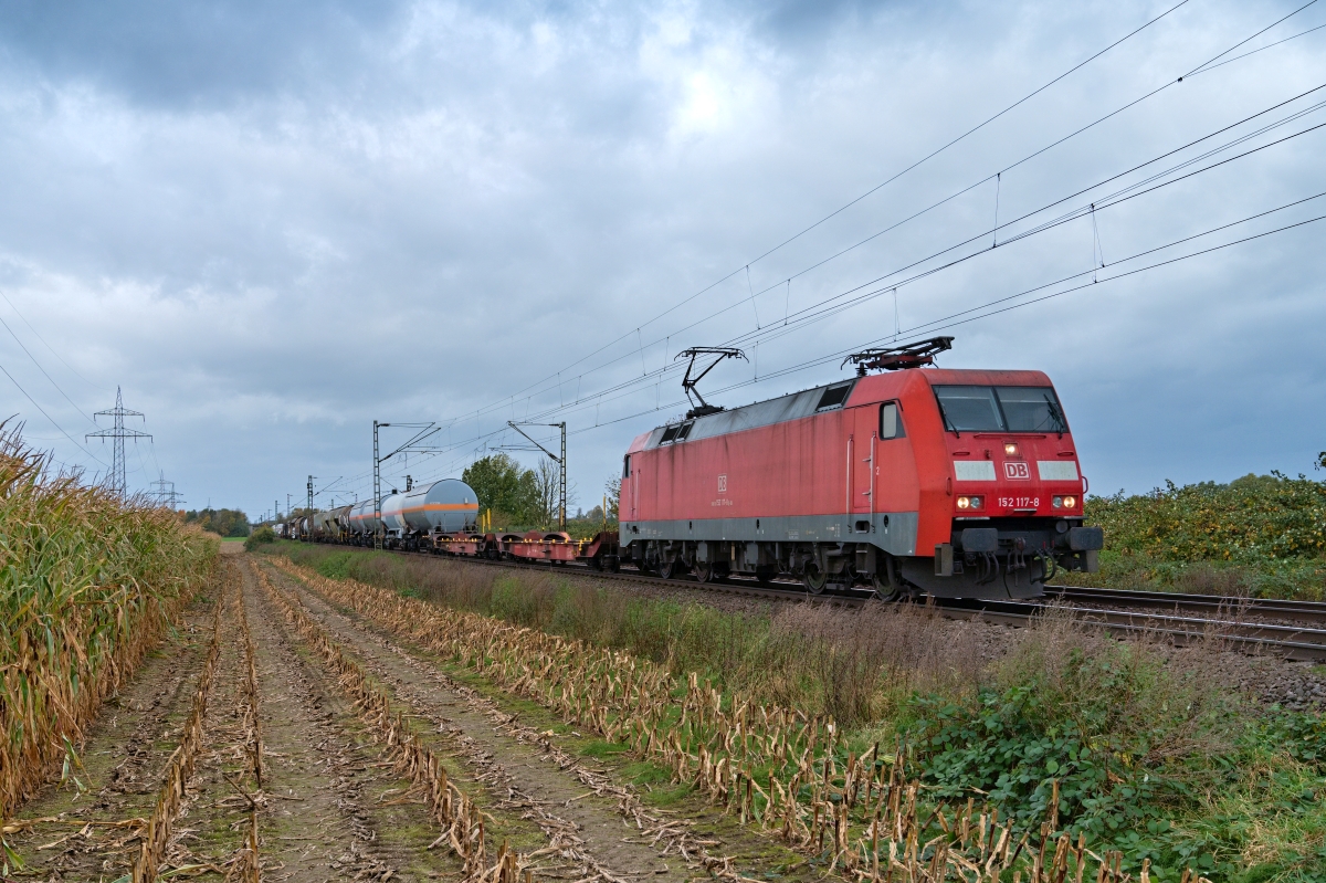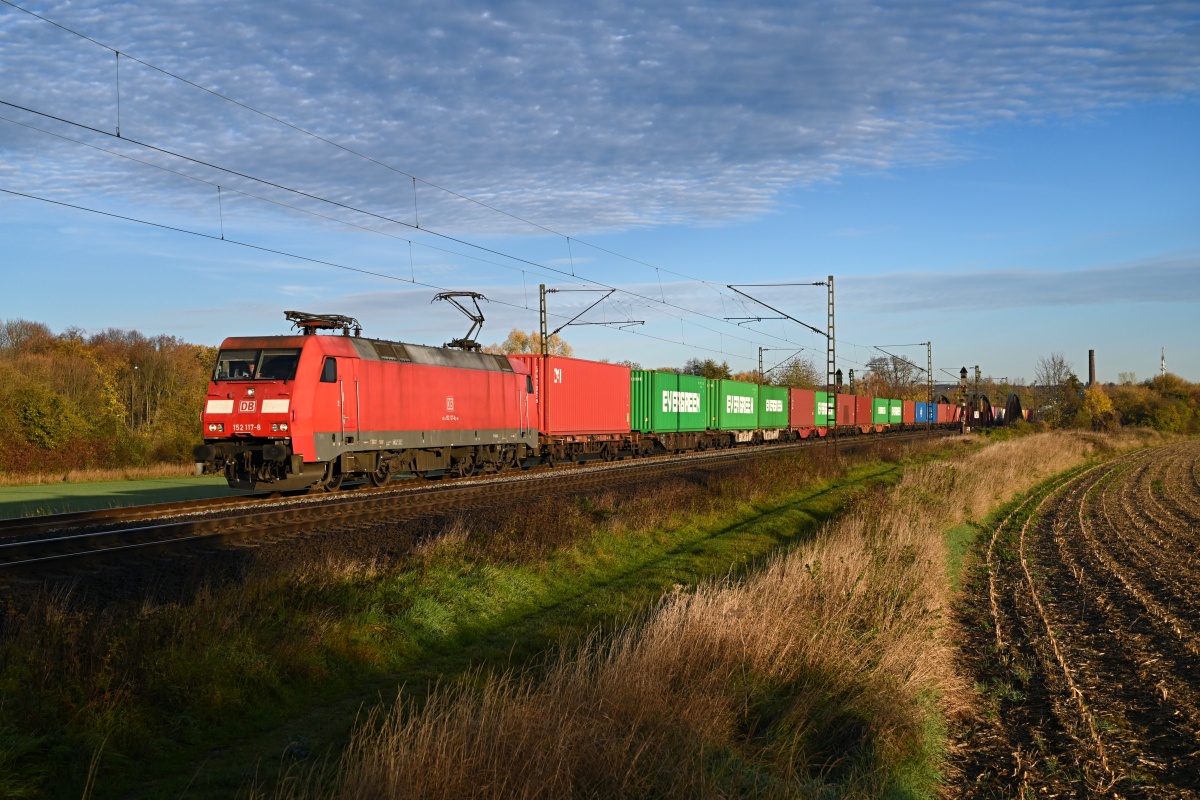 Dto. 152 117-8 am 12.11.2022 im Morgenlicht bei Elze (HELZ) mit dem KT 50441