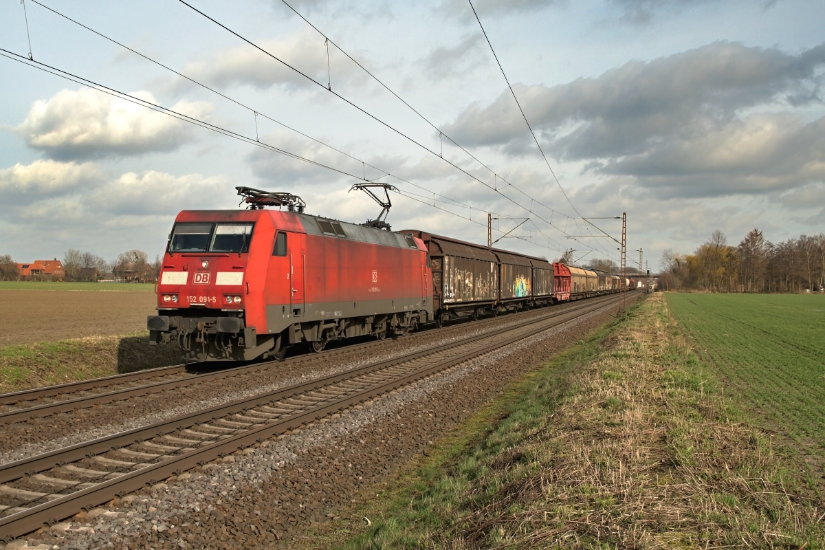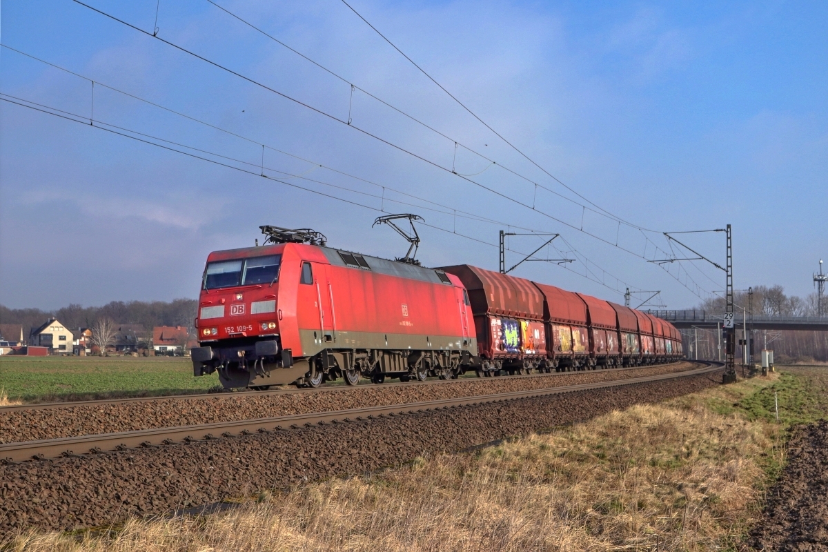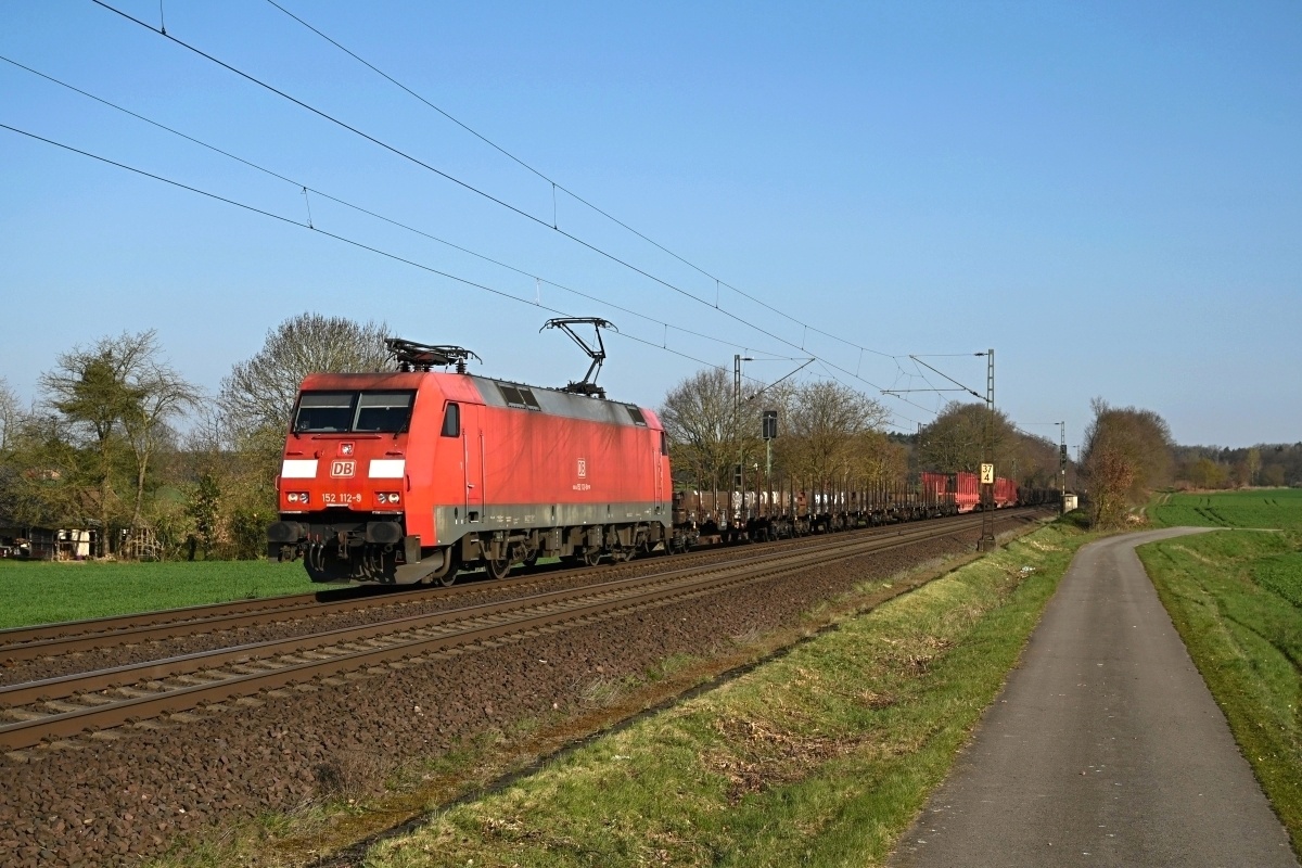 Dto. 152 112-9 am 06.04.2023 bei Eilvese (HEIV) mit einem Stahlzug Rtg.