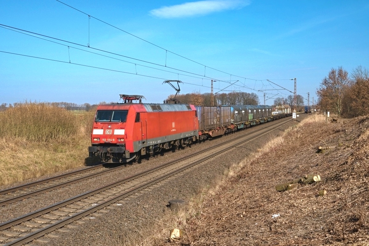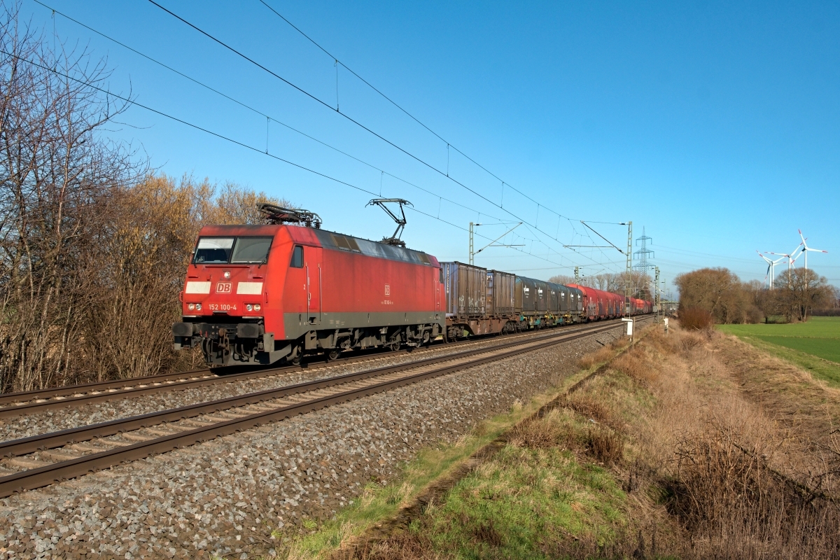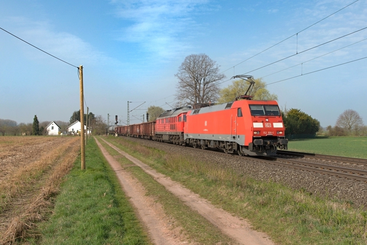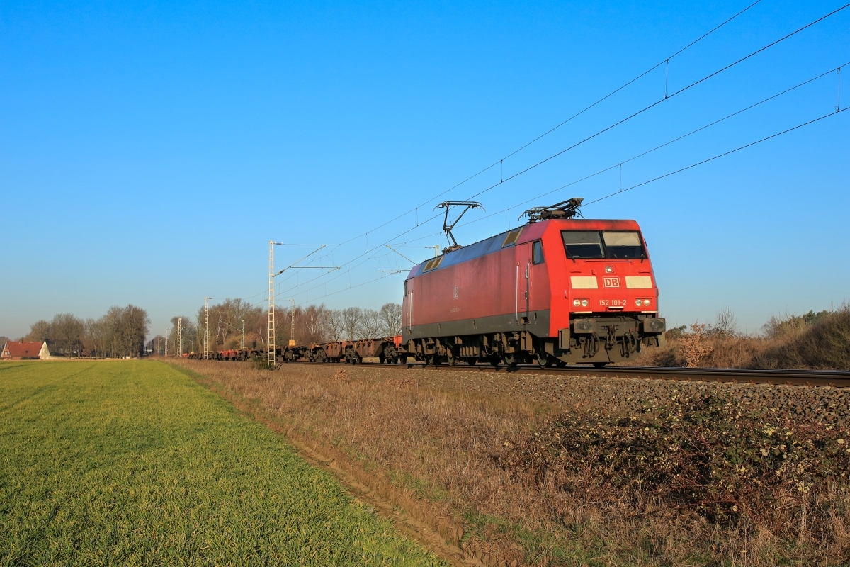 Dto. 152 112-9 am 06.04.2023 bei Eilvese (HEIV) mit einem Stahlzug Rtg.