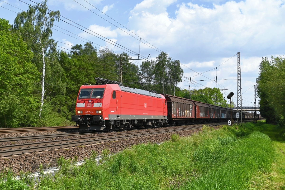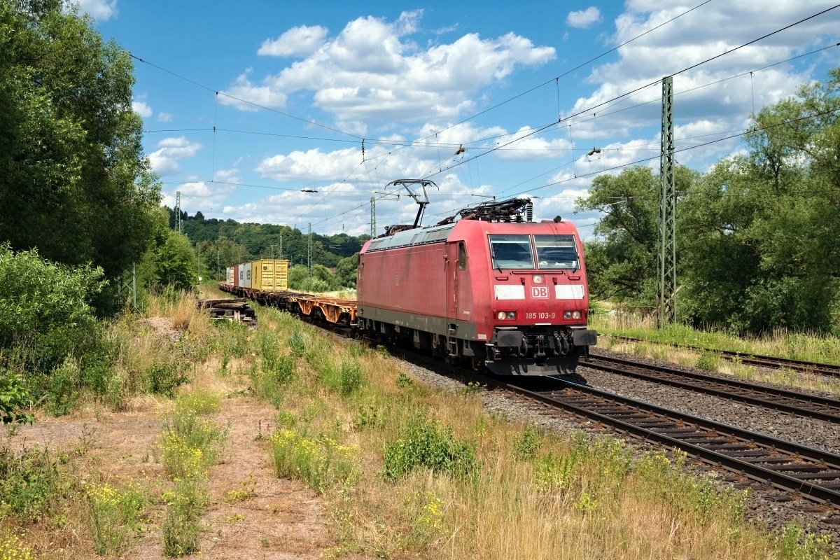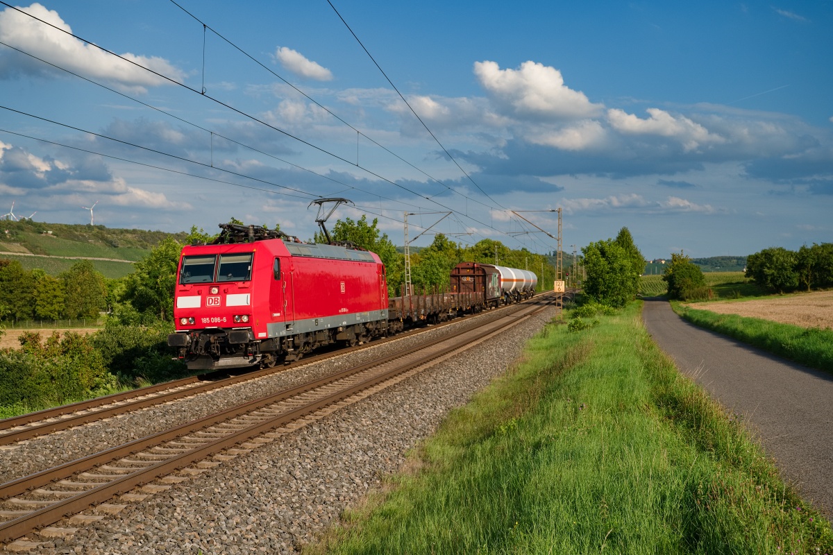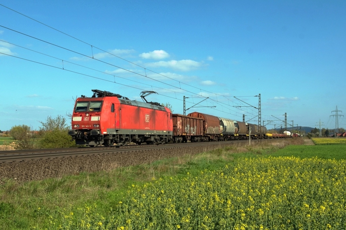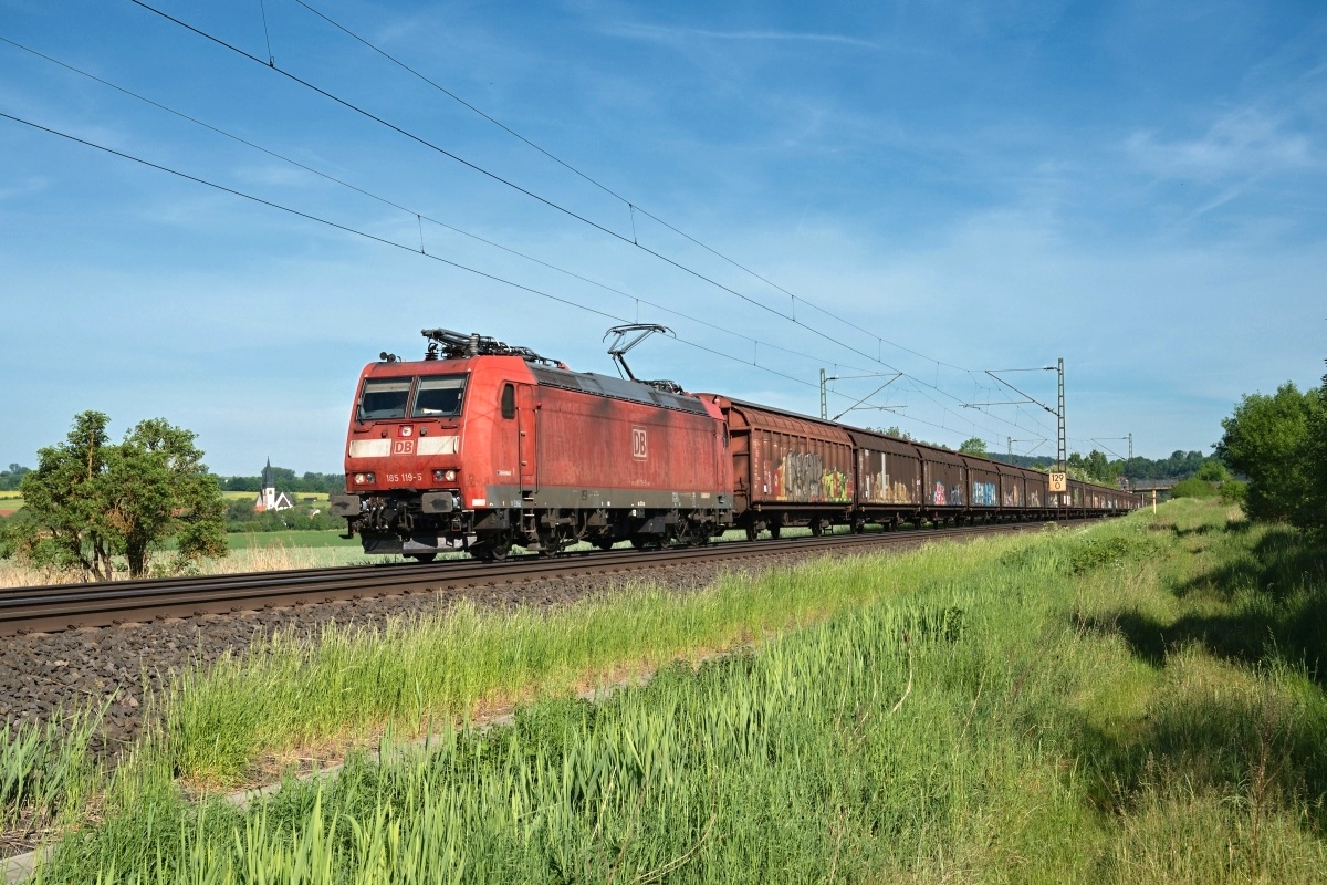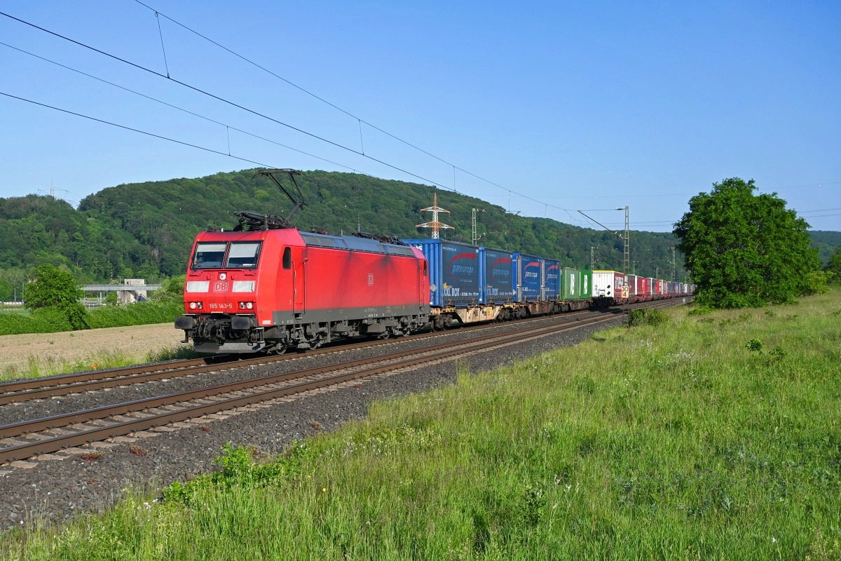 Dto. 185 143-5 am 26.05.2023 im Maintal bei Harrbach mit einem KLV Rtg.