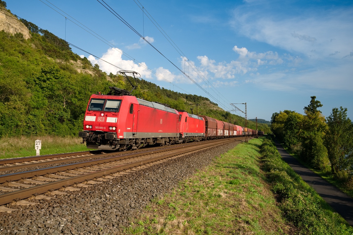 185 089-0 war hier am 16.08.2023 bei Gambach im Maintal mit 185 257-3 und