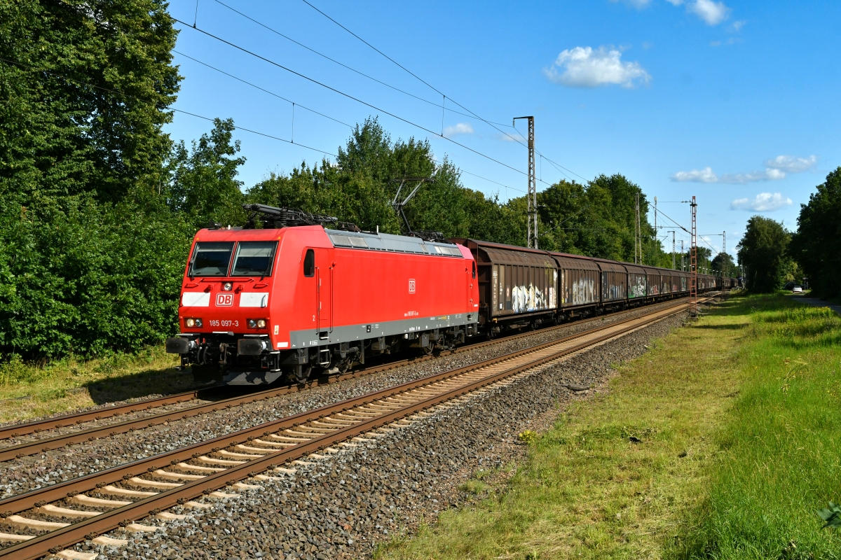 Dto. 185 097-3 am 23.08.2021 im Bahnhof Lunestedt (HLUN) mit dem RedBull Zug