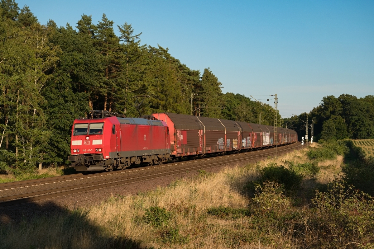 Dto. 185 142-7 am 12.08.2022 im Abendlicht bei Linsburg (HLBU) mit mit einem
