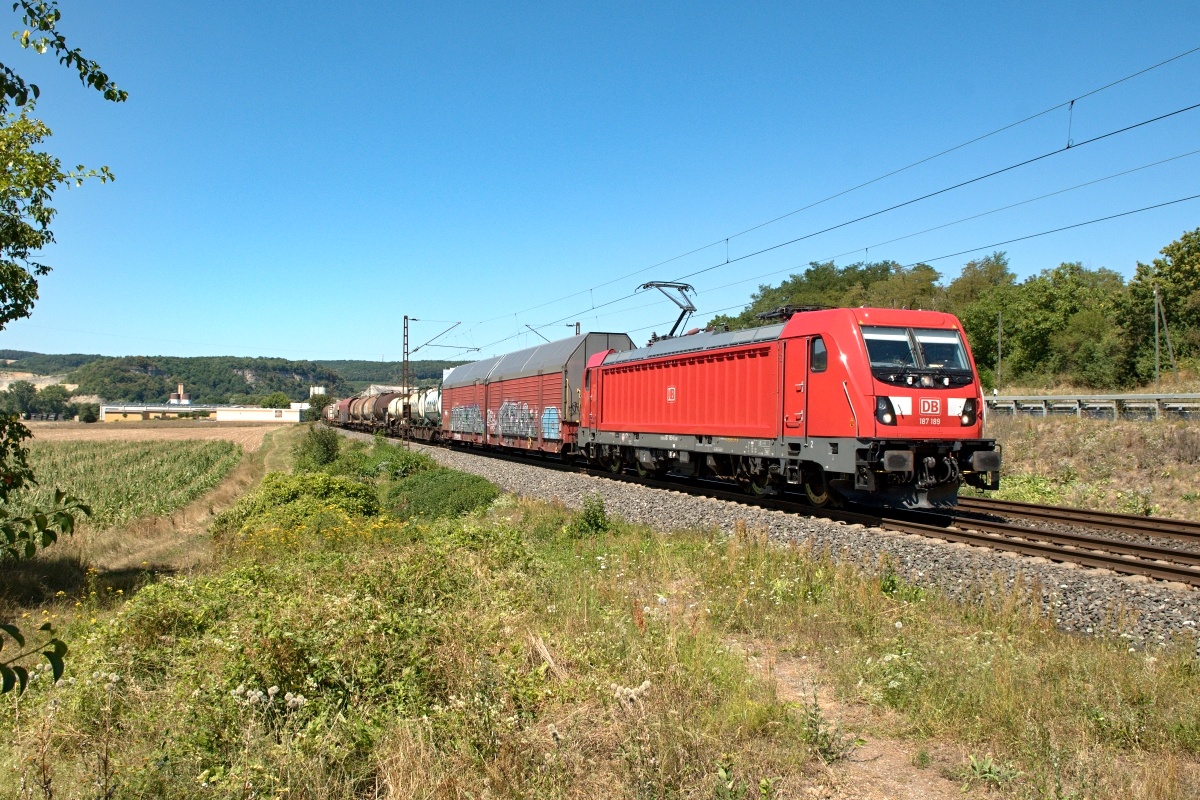 187 142-5 (NVR 91 80 6187 142-5 D-DB) war hier am 24.08.2024 im Maintal bei Wernfeld (NWFH) mit einem EZ Rtg.