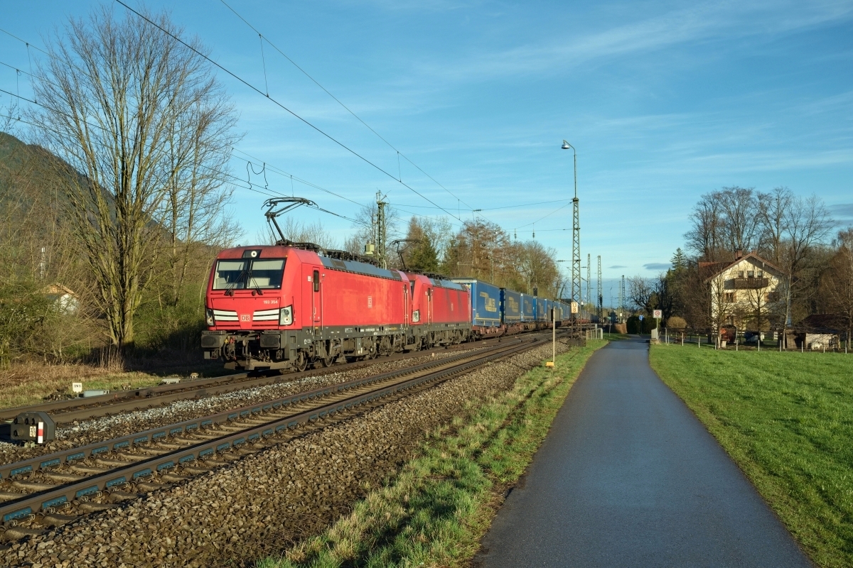 Dto. 193 354-8 am 06.04.2022 bei Brannenburg (MBB) mit 193 355-5 und dem LKW