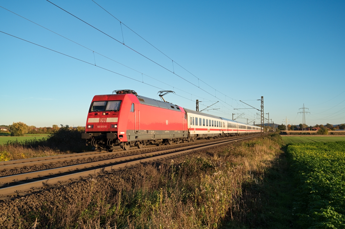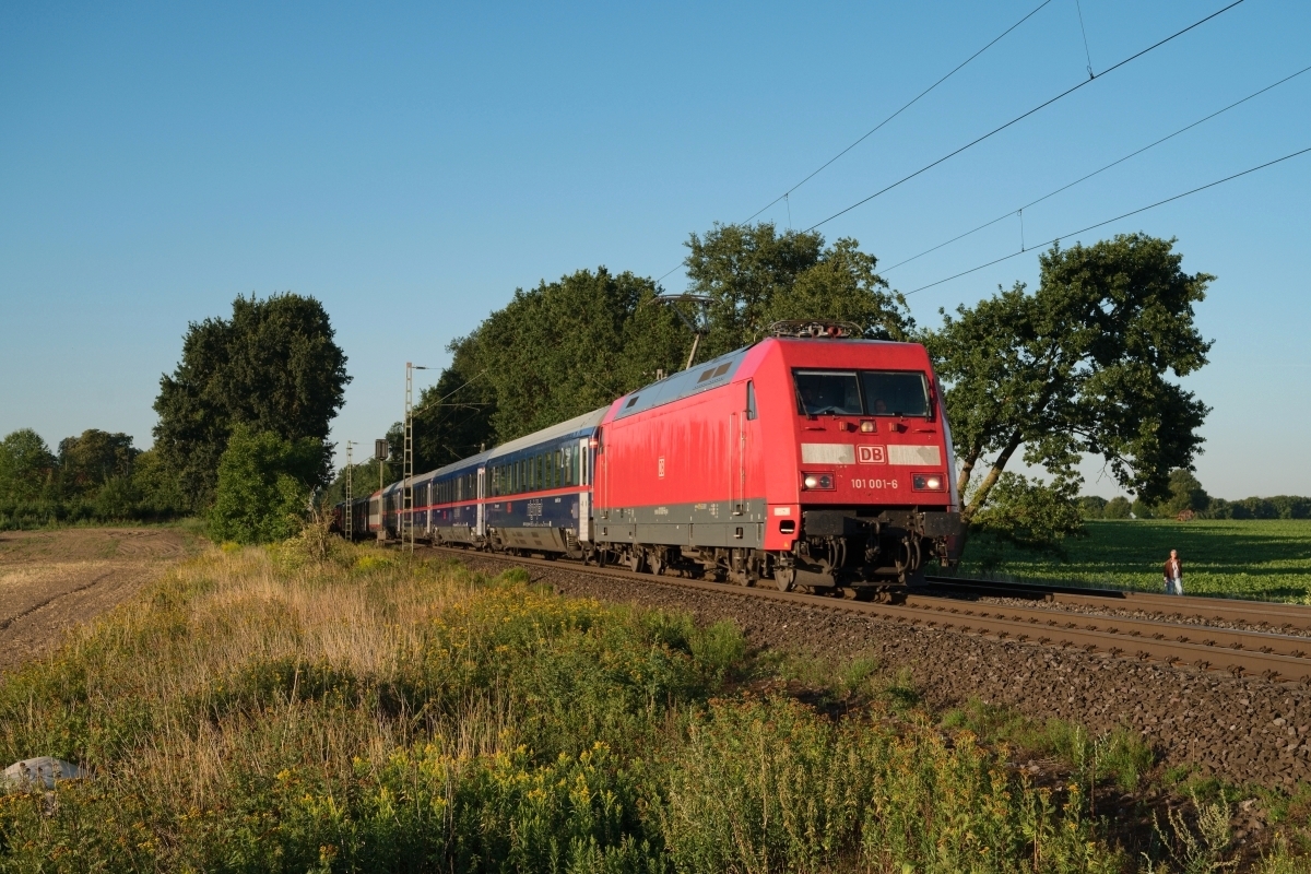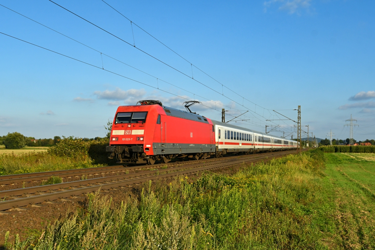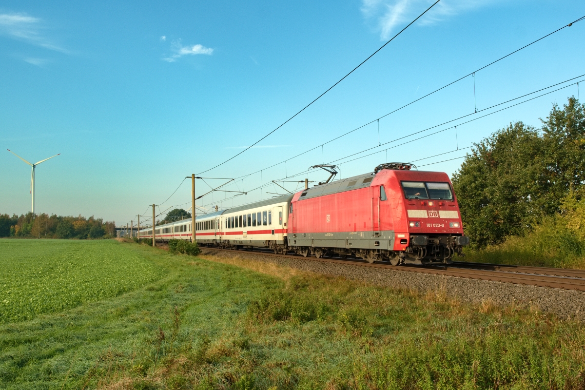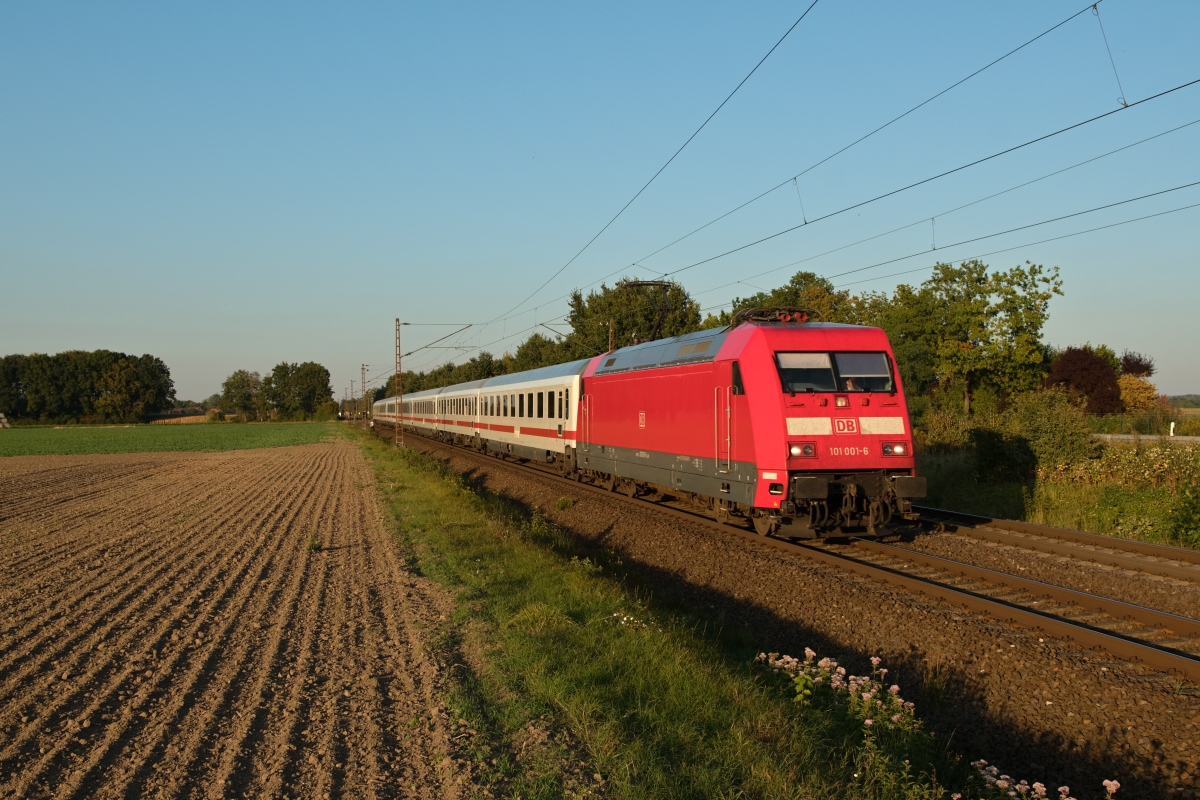 Dto. 101 001-6 am 21.09.2020 zur goldenen Stunde bei Bückeburg (HBKB) mit dem IC 2442 von
