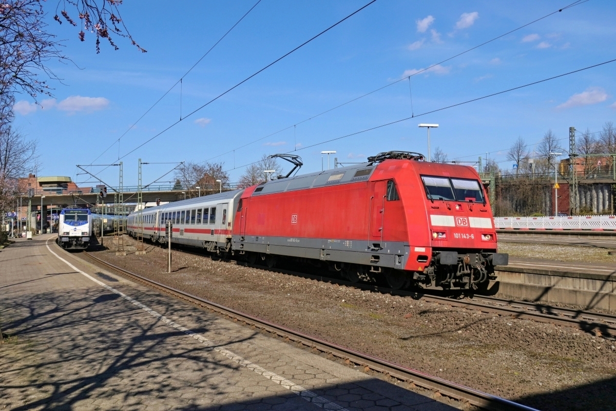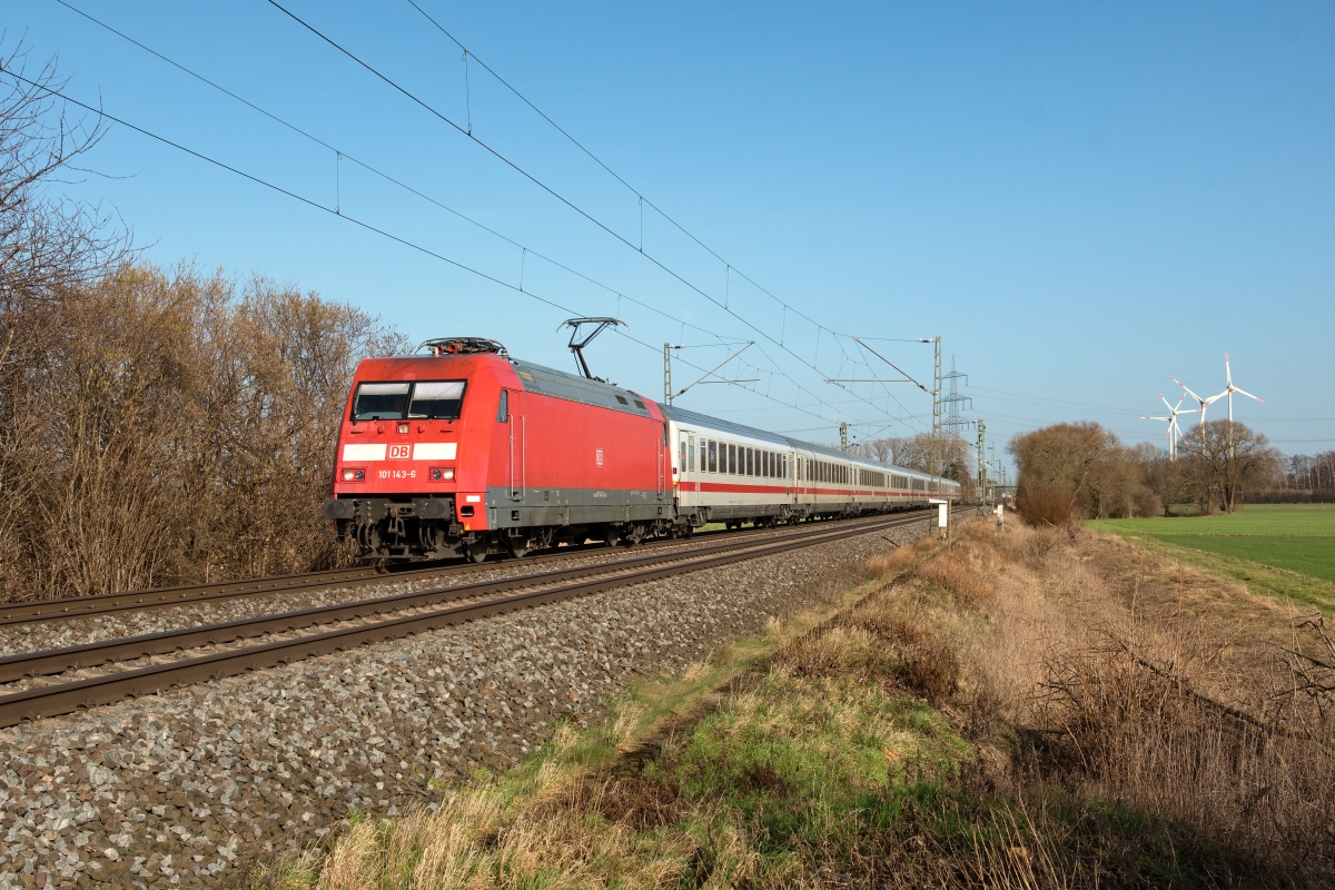 Dto. 101 143-6 am 24.02.2021 bei Lindhorst (HLH) mit dem IC 144 von Berlin