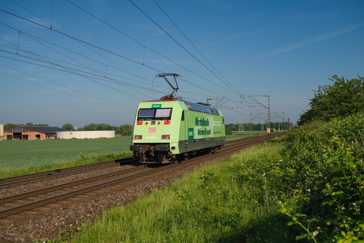 Dto. 101 088-3 früh morgens am 21.05.2024 mit der aktuellen Werbefläche "DEVK--Wir