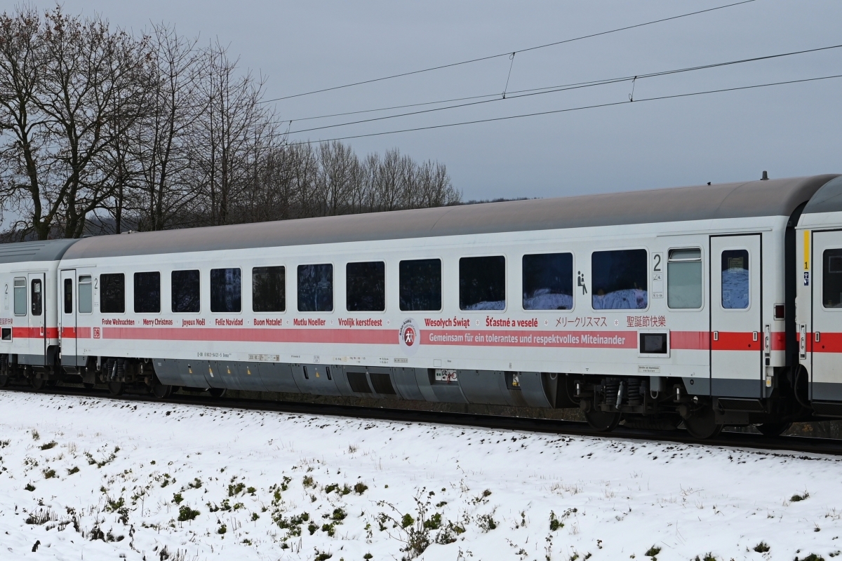 Der zweite und dritte Wagen im Zug waren mit vielsprachigen Weihnachtsgrüßen