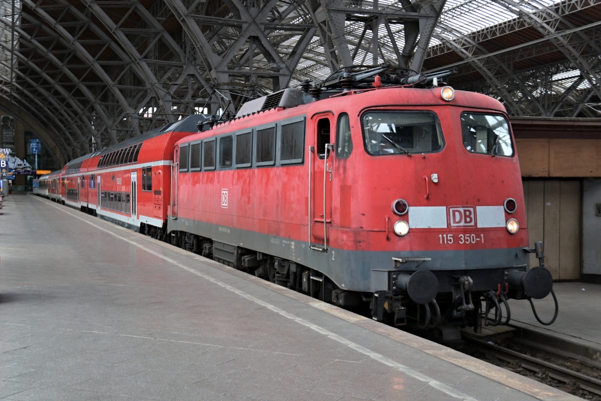 Dto. 115 350-1 am 13.04.2017 mit einem Dbz im Leipziger Hbf auf Abfahrt