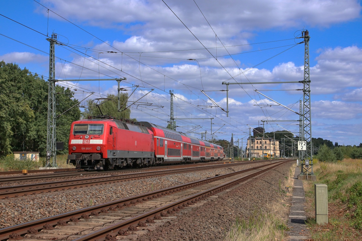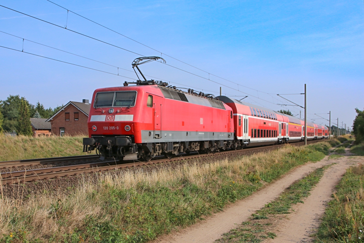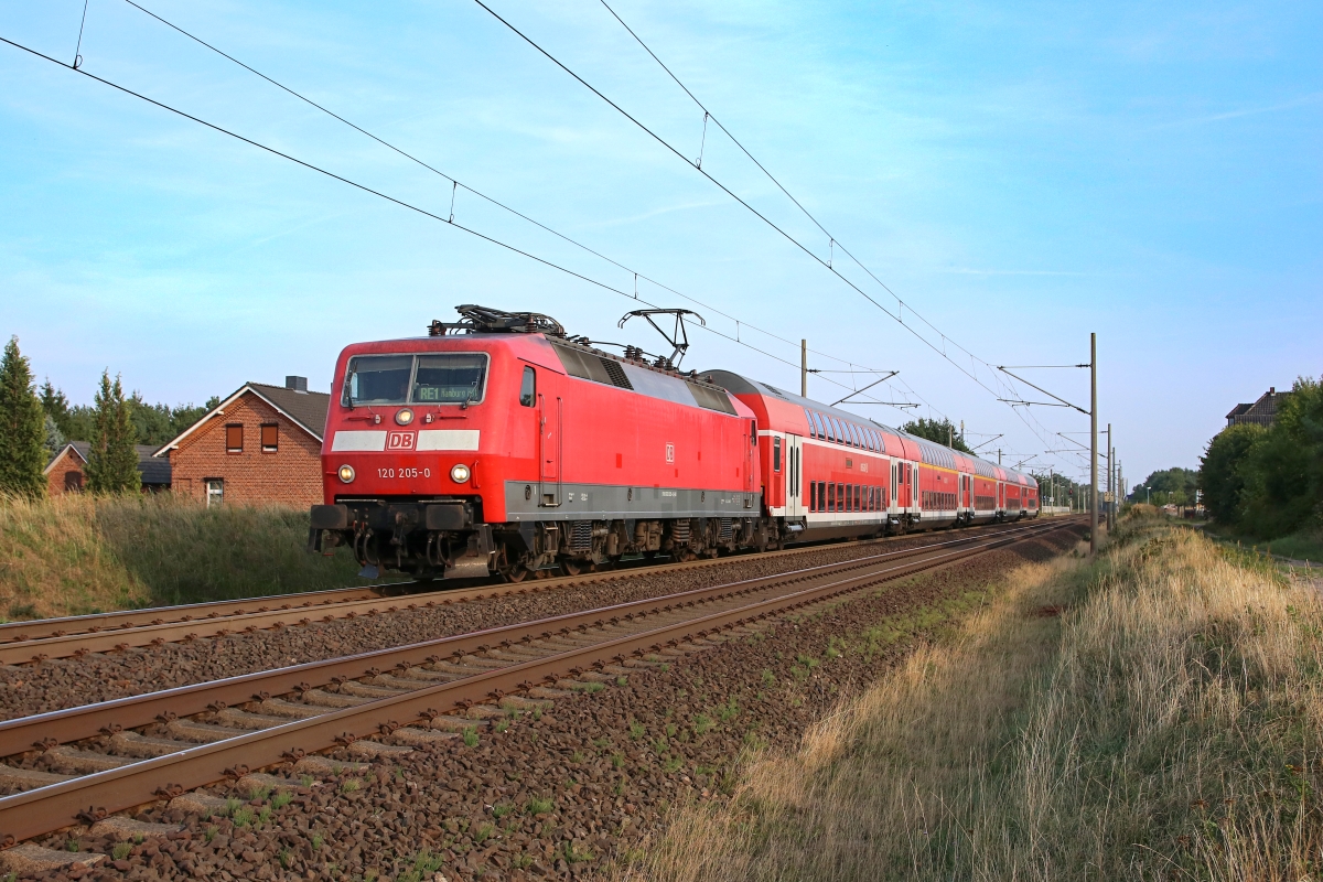 Dto. 120 205-0 am 29.08.2018 in Schwanheide mit dem RE1 auf dem Rückwege von
