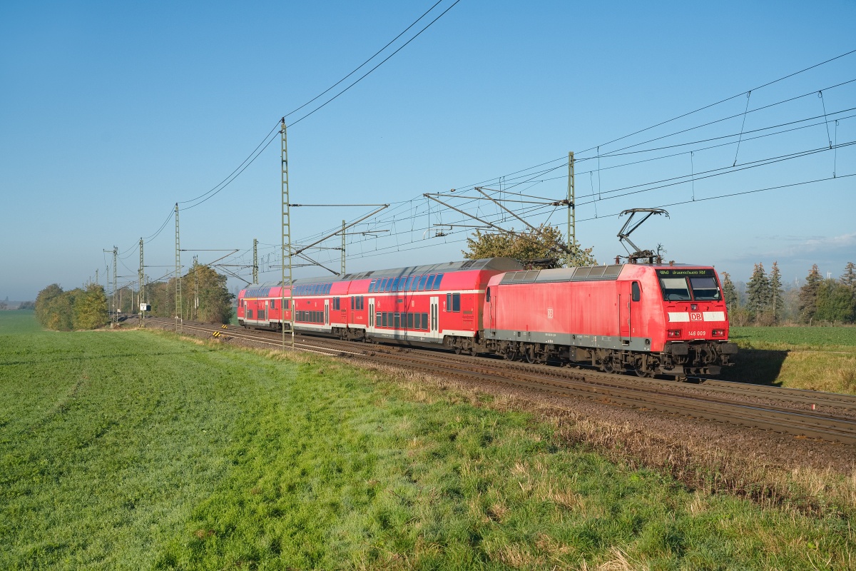 Dto. 146 009-6 früh morgens um 08:08 Uhr am 25.10.2024 bei Dreileben-Drackenstedt (LDD)