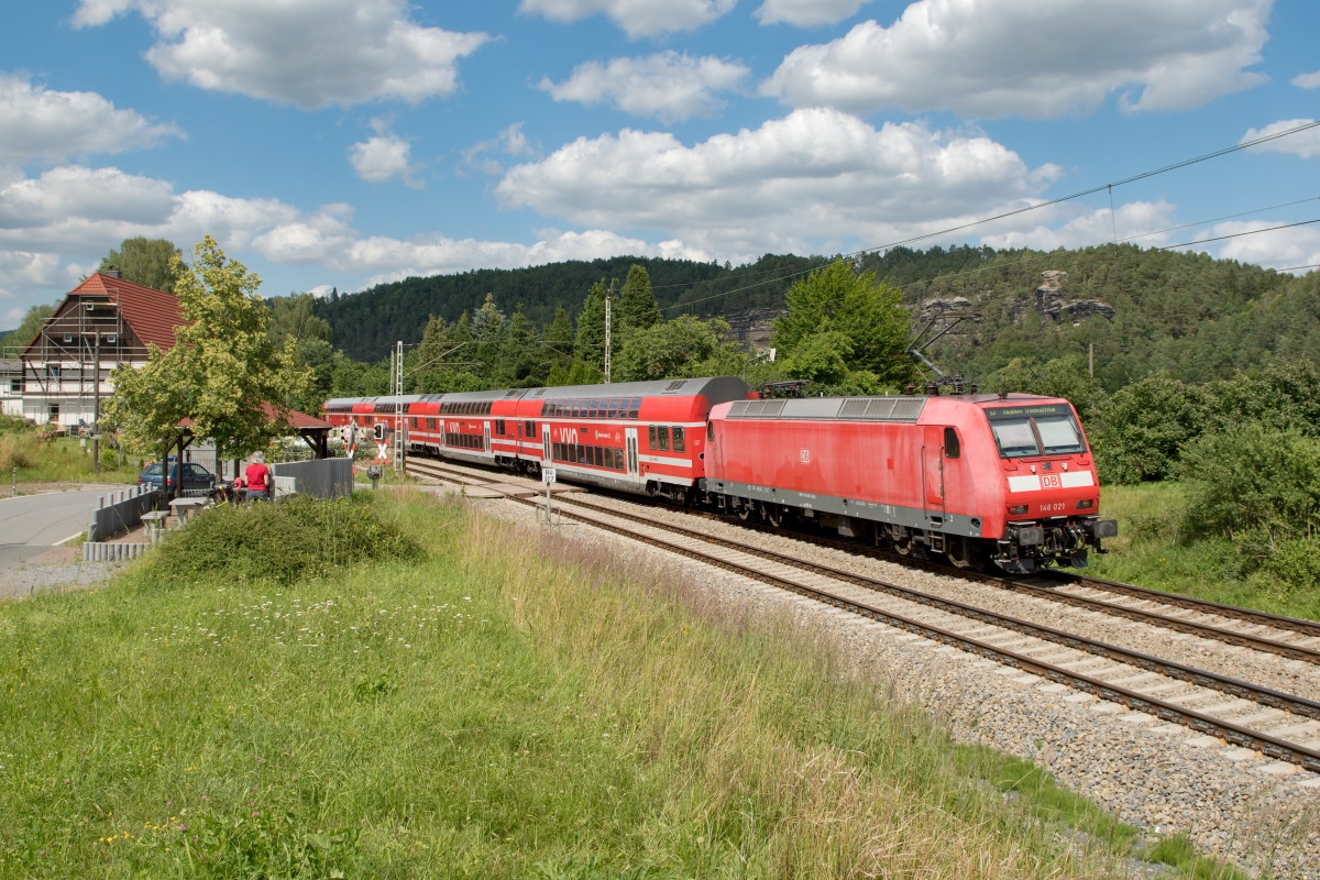 Dto. 146 021-1 am 06.07.2021 als Schublok für die S1 bei Kurort Rathen