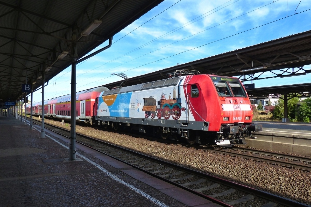 Dto. 146 025-2 am 06.08.2022 mit der aktuellen Werbefolie "Verkehrsmuseum
