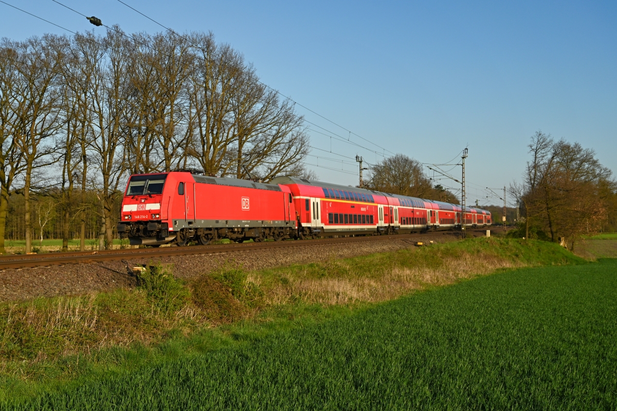 hier am 21.04.2023 im Abendlicht bei Linsburg (HLBU) mit dem RE8 (4428) nach
