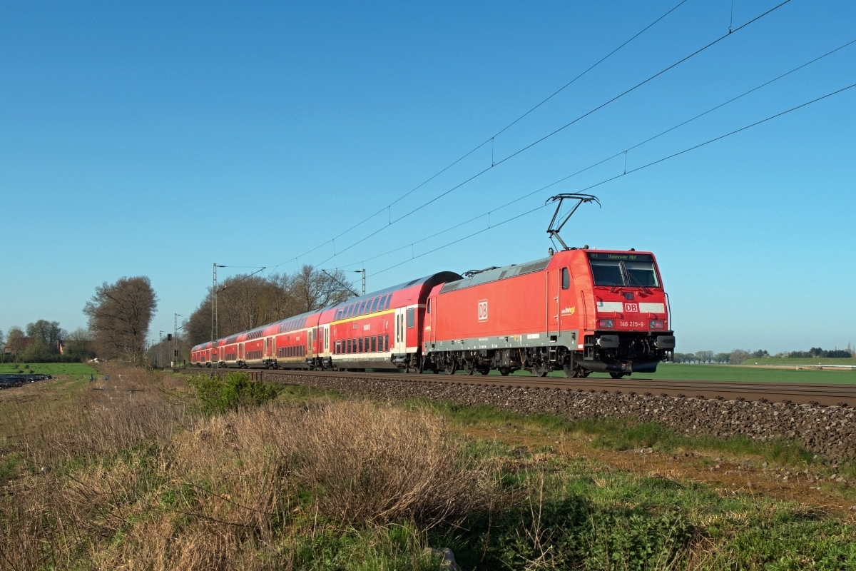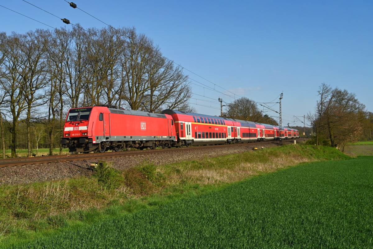 Dto. 146 215-9 am 21.04.2023 bei Linsburg (HLBU) mit dem RE1 (4426) nach