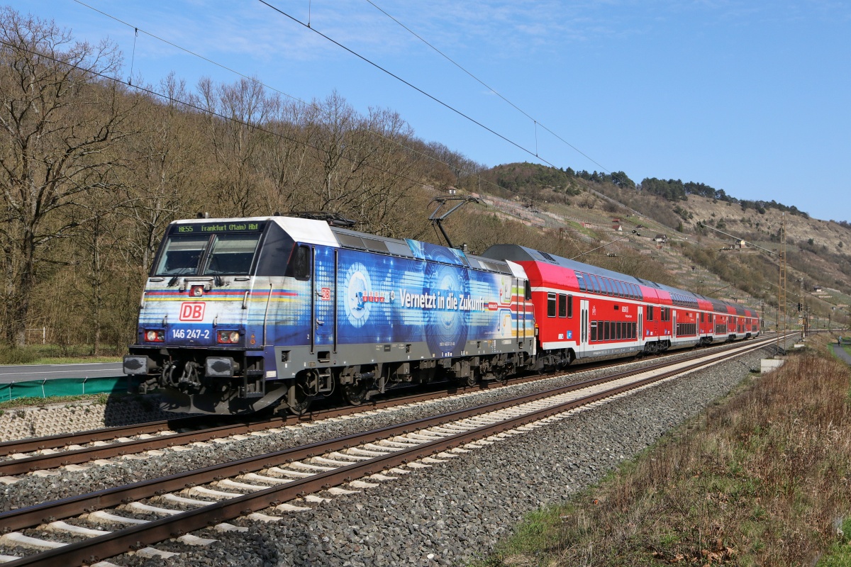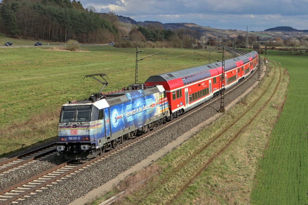 Dto. 146 247-2 am 08.04.2018 mit Lokseite 2 voraus bei Gambach und dem RE55