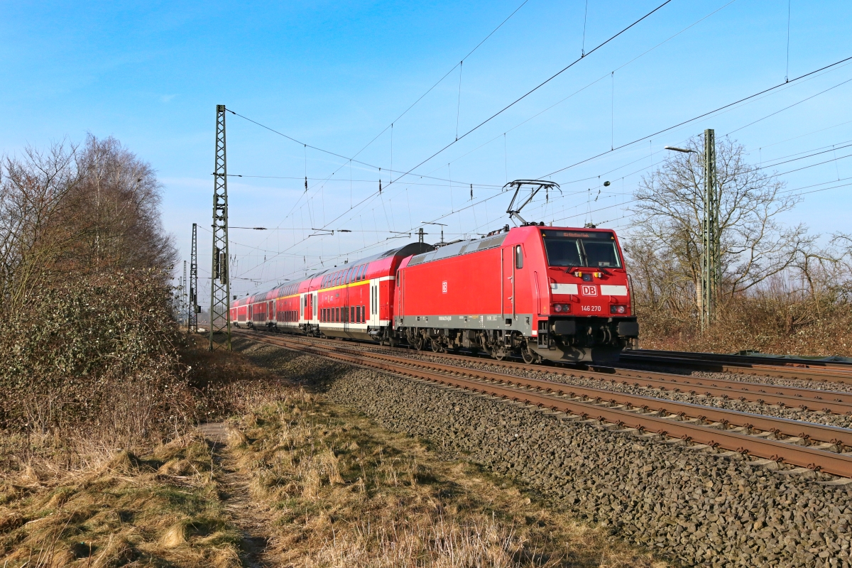 146 270-4 (NVR: 91 80 6146 270-4 D-DB) passierte hier am 06.03.2018 Vennebeck mit dem RE6 Rtg. Minden...