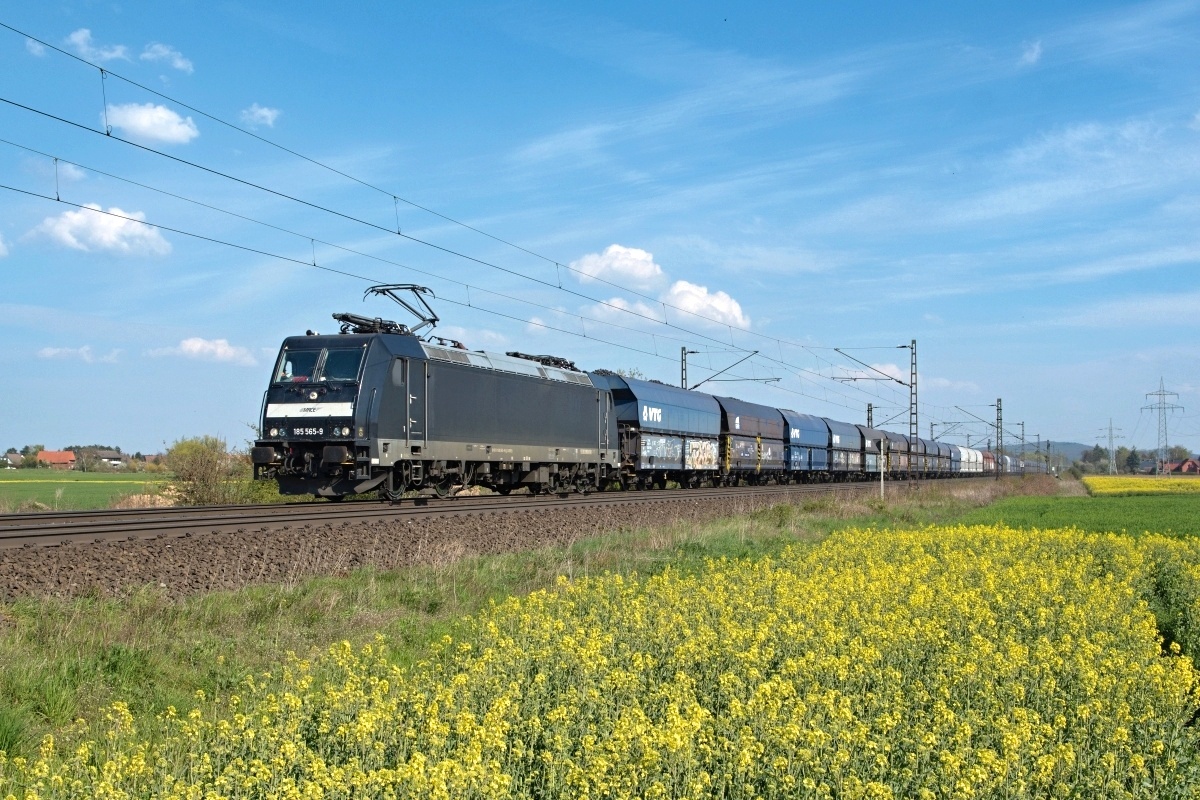 war hier am 20.04.2021 bei Bückeburg (HBKB) Evesen mit einem Ganzzug aus VTG