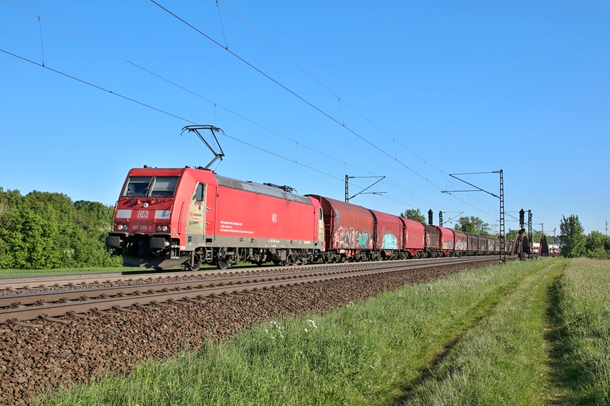 Dto. 185 336-2 am 08.05.2018. Hier passierte die Lok den Km 34.0 bei Elze