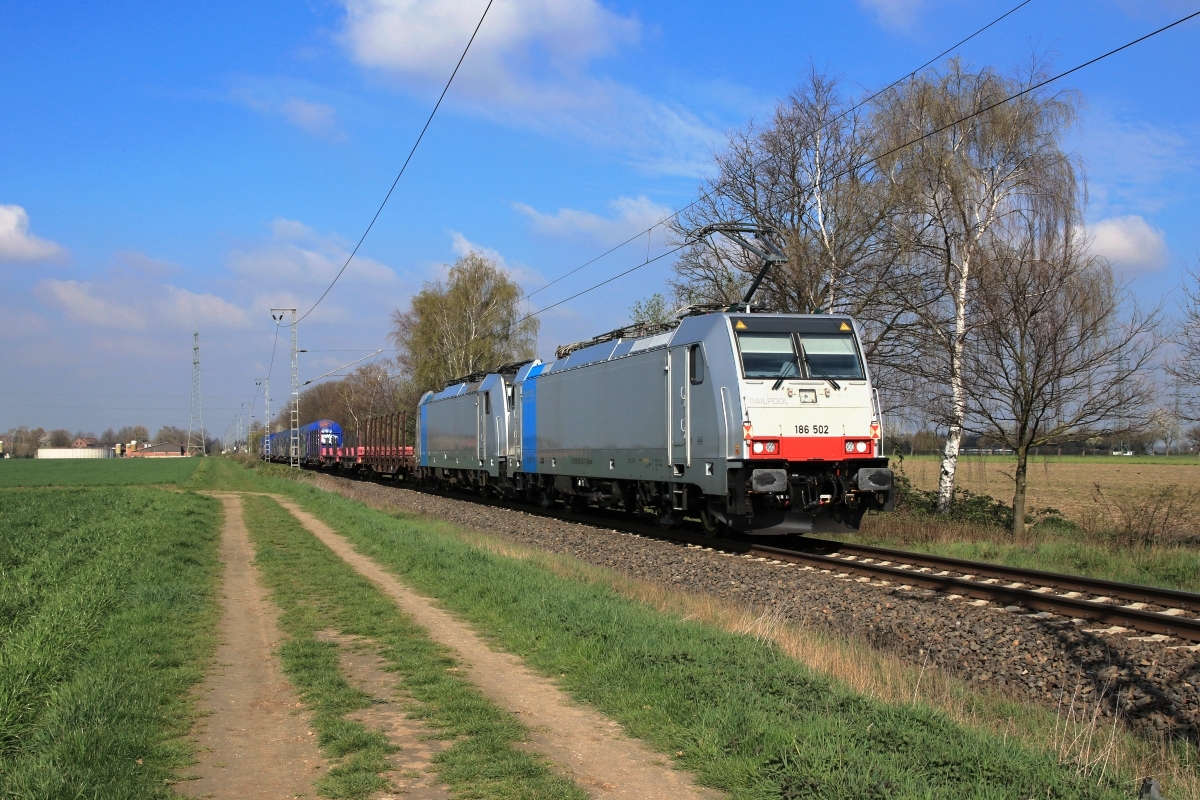 war hier am 05.04.2019 bei Dülken (KDUL) mit Wagenlok 186 459-4 und einem EZ