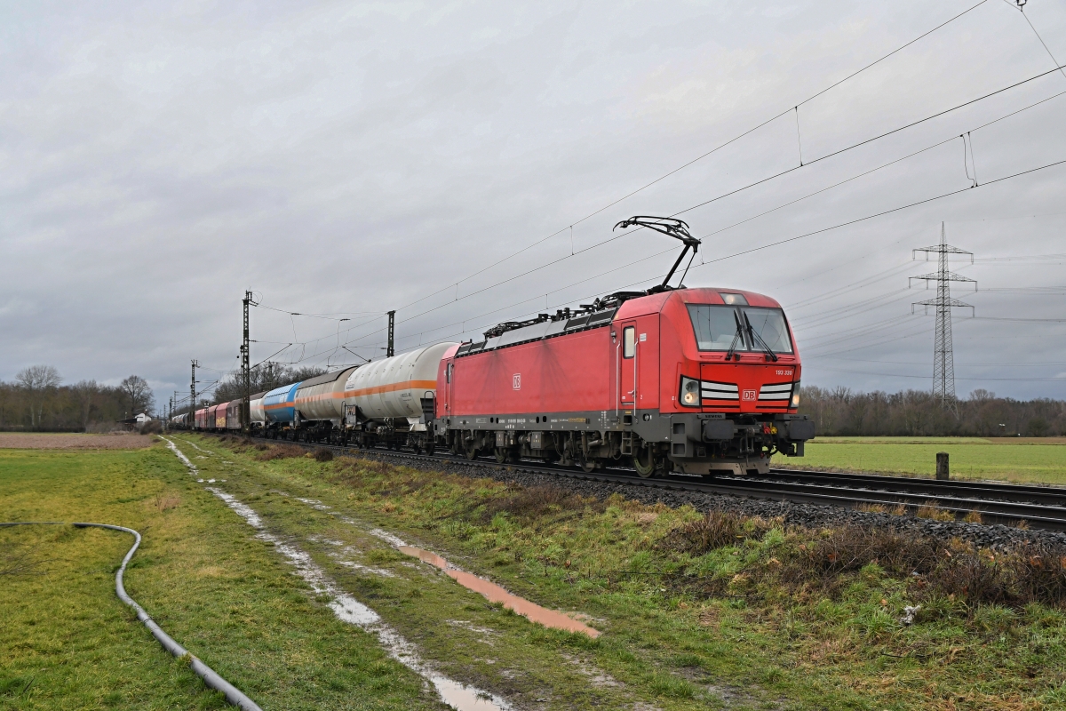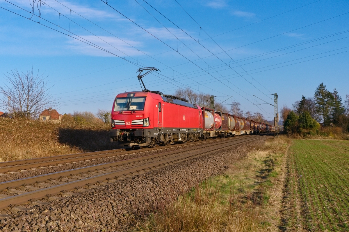 Dto. 193 341-5 früh morgens am recht kalten 13.12.2022 bei Nordstemmen (HNOS) Poppenburg mit einem EZ Rtg. Süden/Göttingen (HG)...