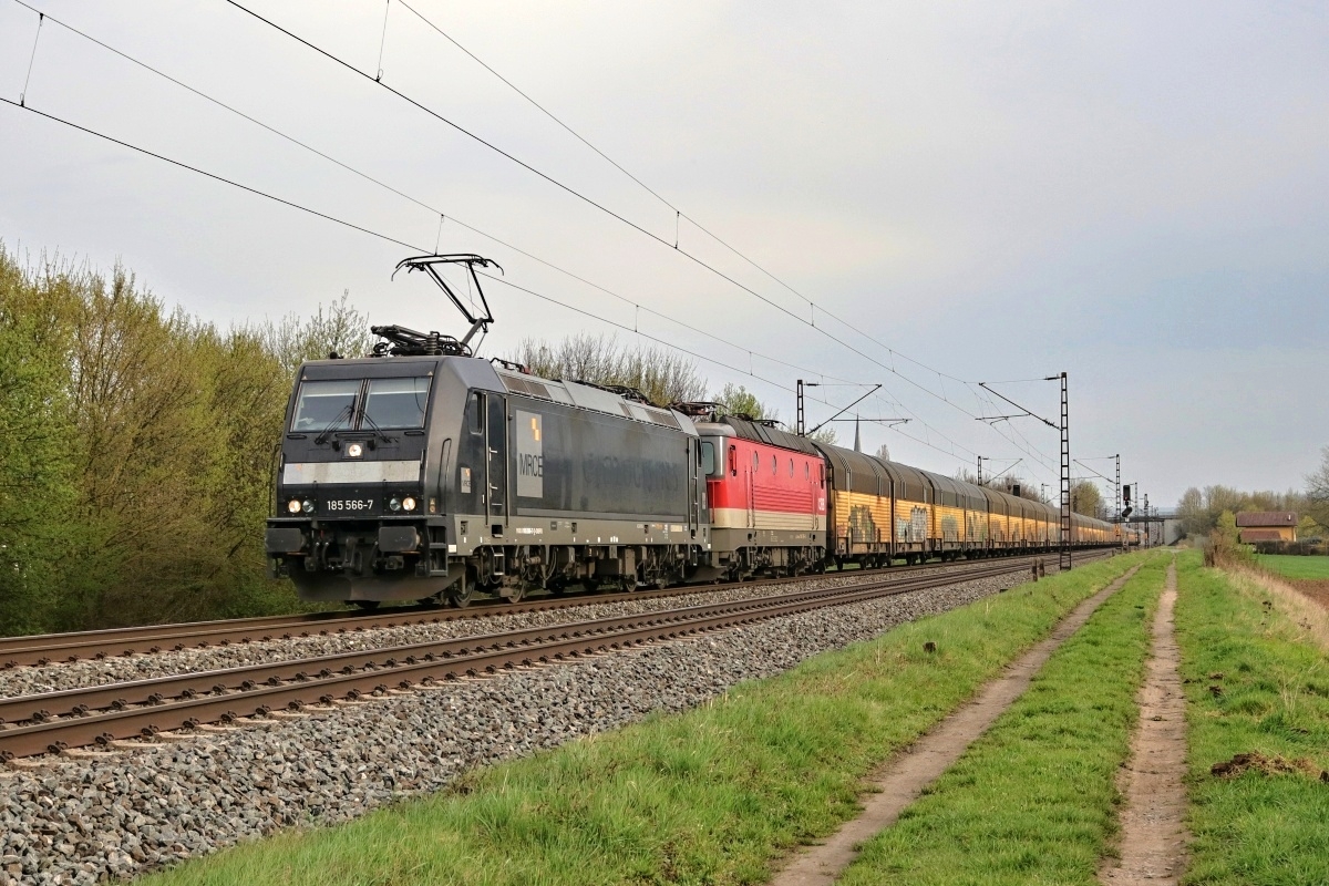 185 566-7 passierte hier am 10.04.2018 Thüngersheim mit Wagenlok 1144 266-4