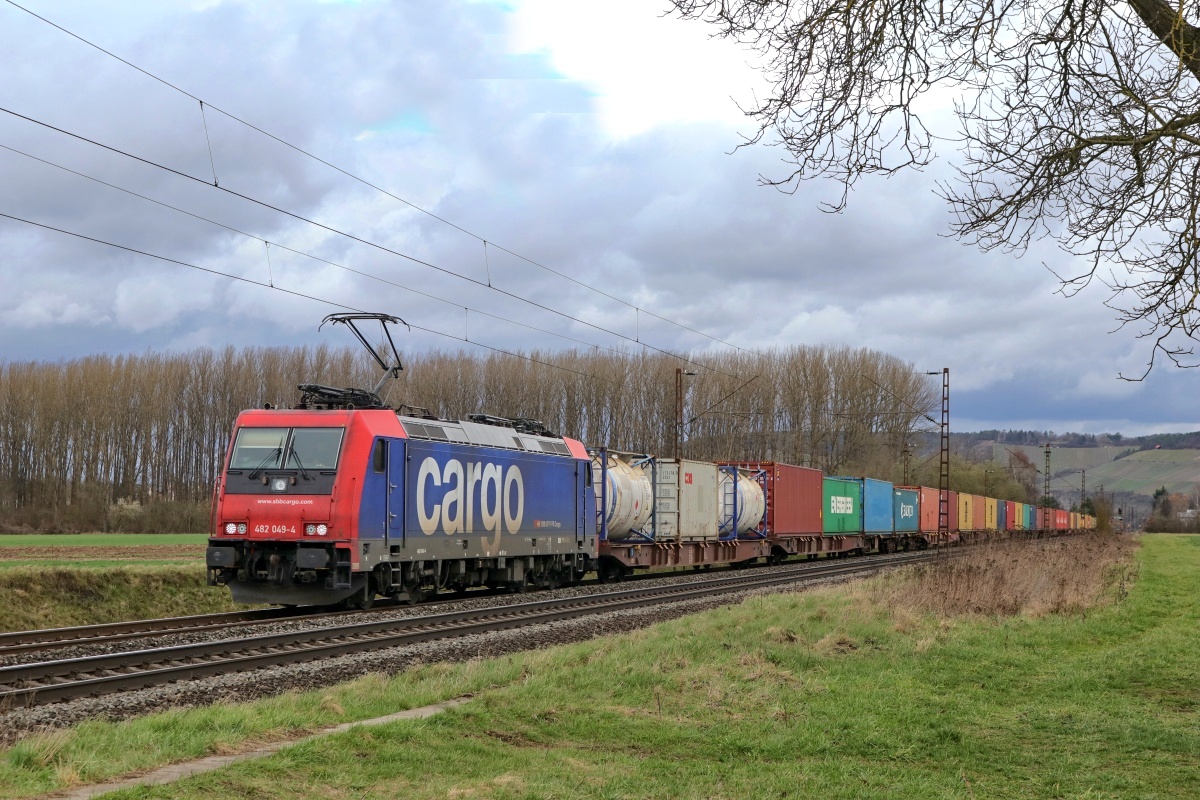 Dto. 482 049-4 am 05.04.2018 bei Retzbach-Zellingen (NREZ) mit einem CT-Zug Rtg.
