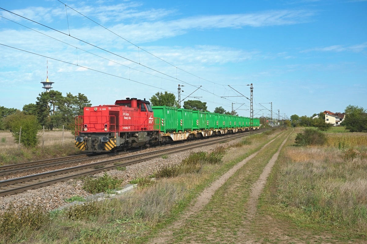 am 29.09.2023 bei Wiesental (RWI) mit einem Müllzug Rtg. Süden/Graben-Neudorf