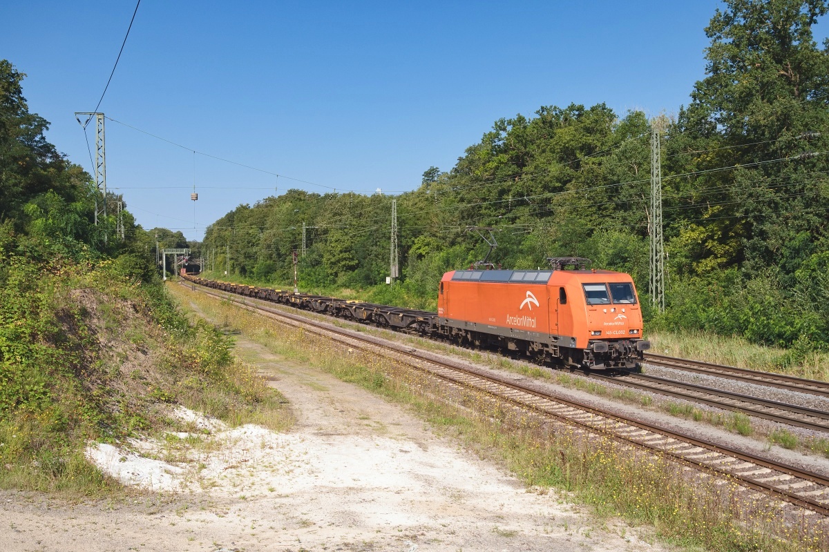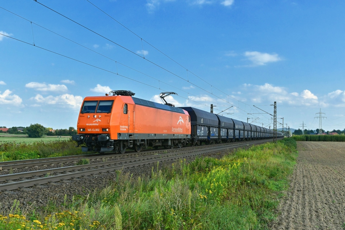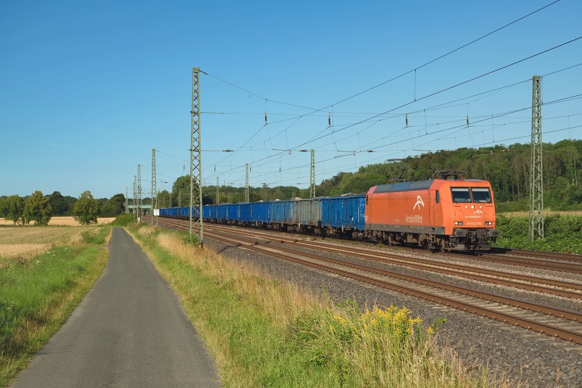 Dto. 145 081-6 am 16.08.2022 im Gümmer Wald (HGUE) mit einem Stahlzug Rtg.