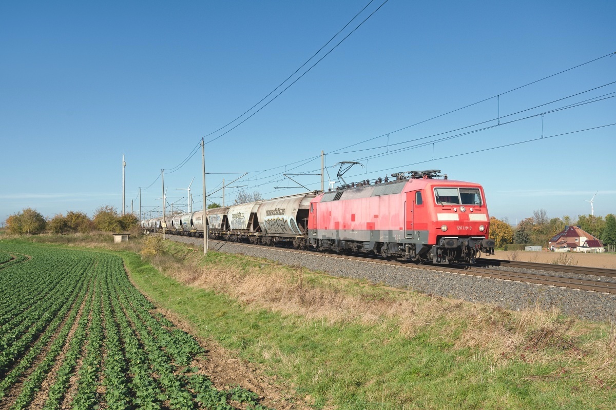 war hier am 24.10.2019 bei Wahlitz (LWH) mit Wagenlok 120 201-9