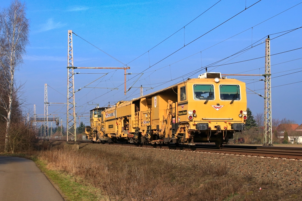 mit einem Gleisbauzug in Nienburg Richtung Süden unterwegs -