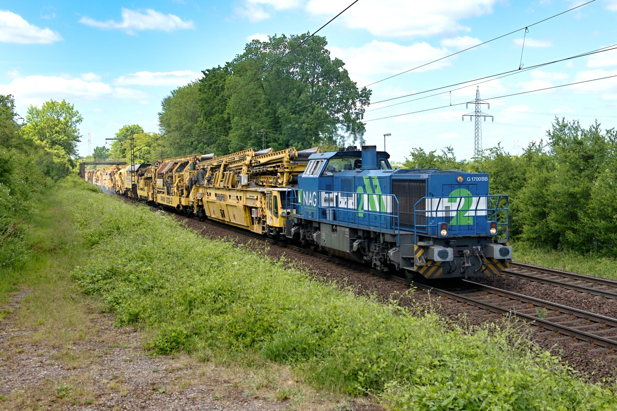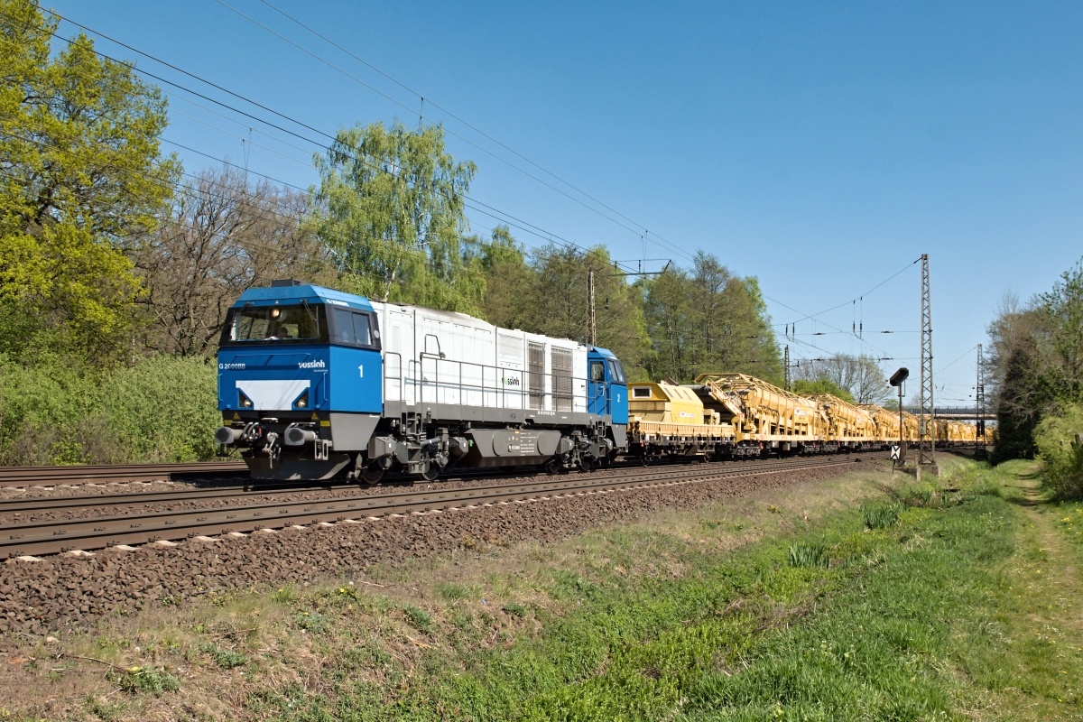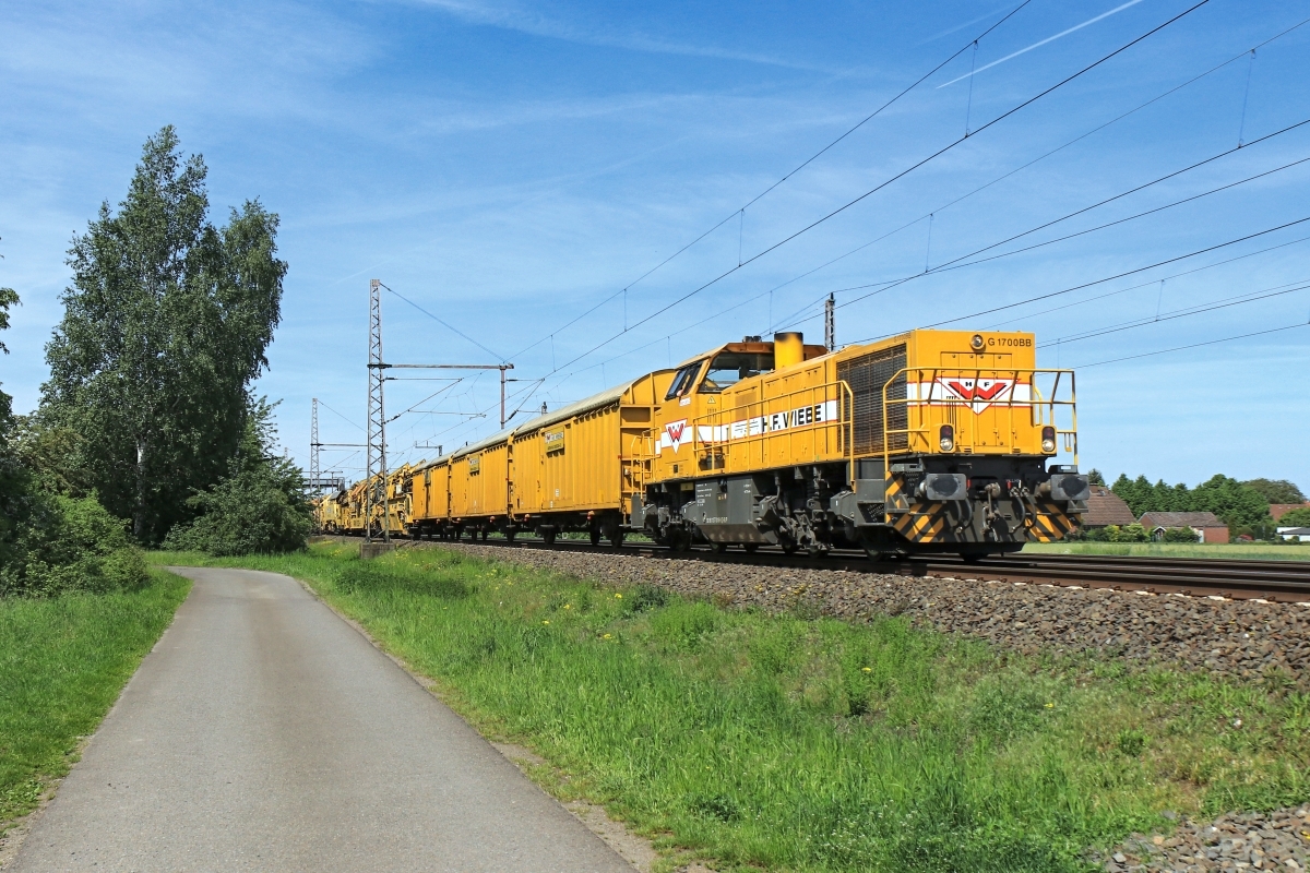 war hier am 28.05.2020 bei Ahlten mit dem Bauzug 99566 von Eystrup nach