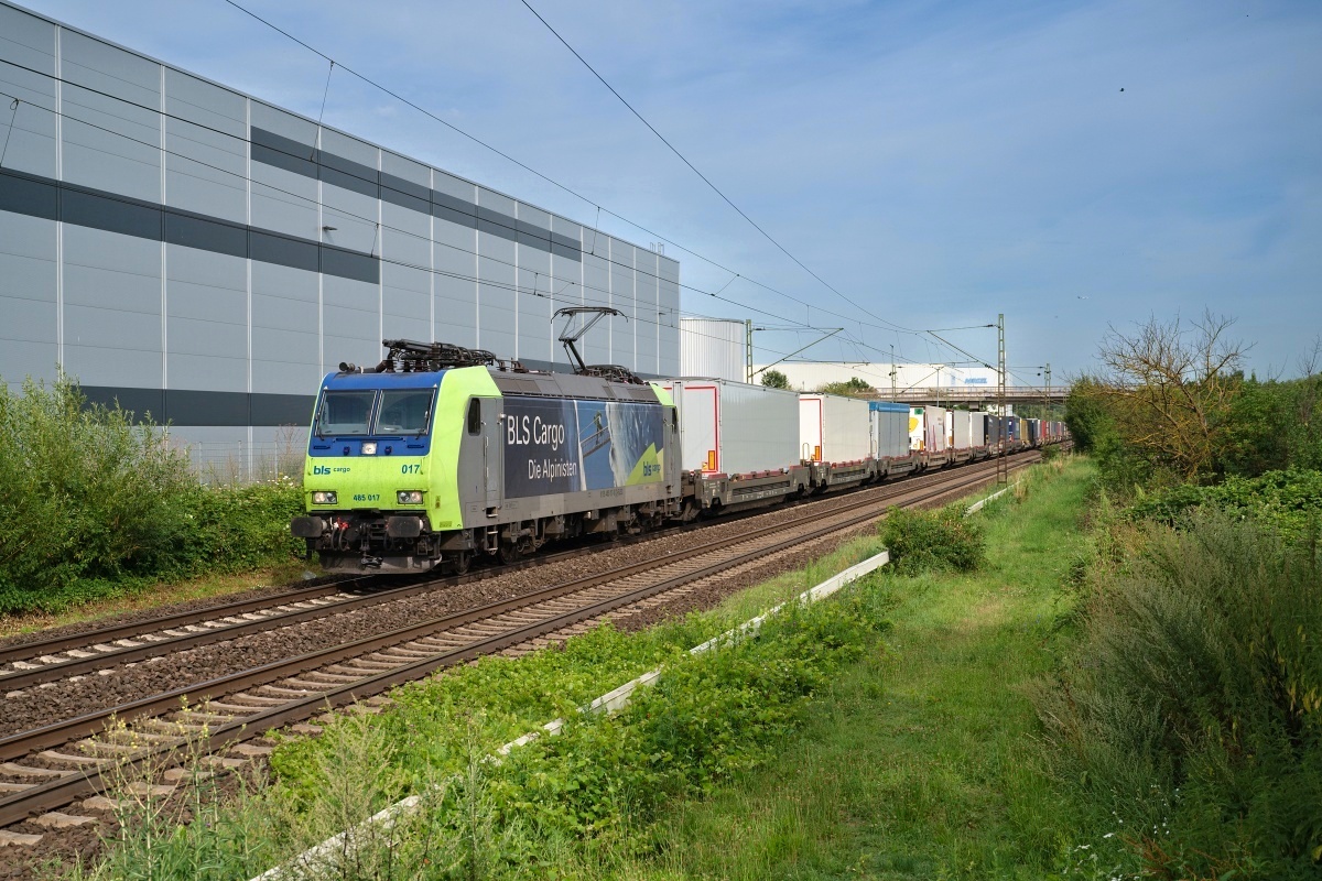 Dto. 485 017-8 am 18.07.2024 bei Groß-Gerau (FGER) mit einem KLVg Rtg. Osten/Weiterstadt (FWI)