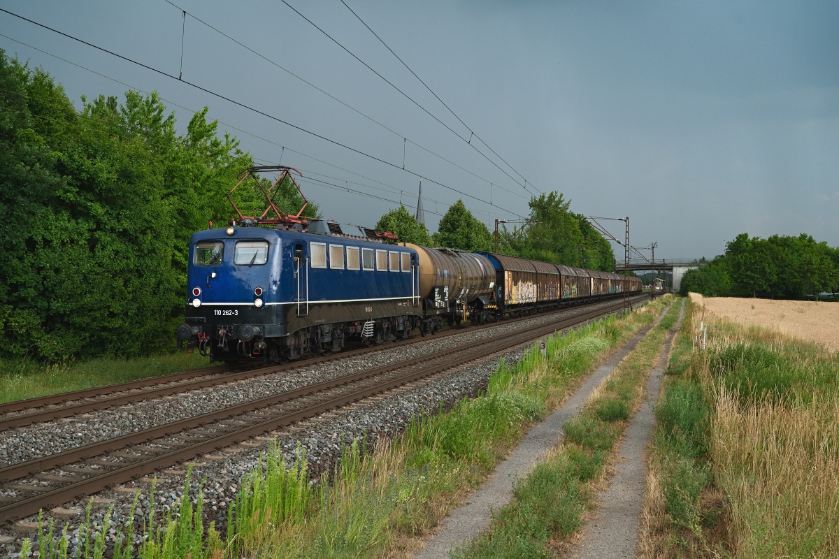 Dto. 110 262-3 bei "grottigem" Himmel am 29.06.2022 bei Thüngersheim (NTHM) mit dem Henkelzug