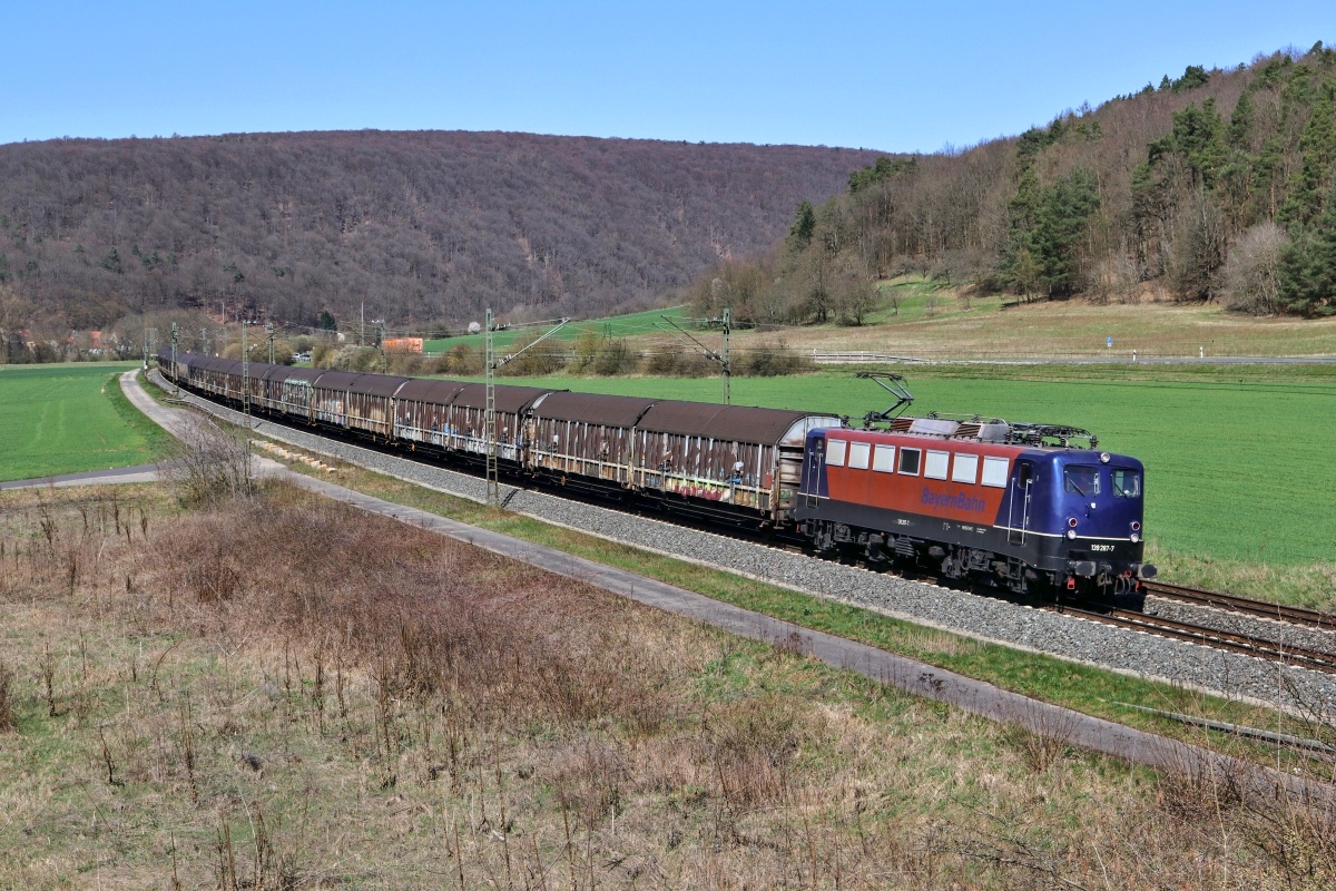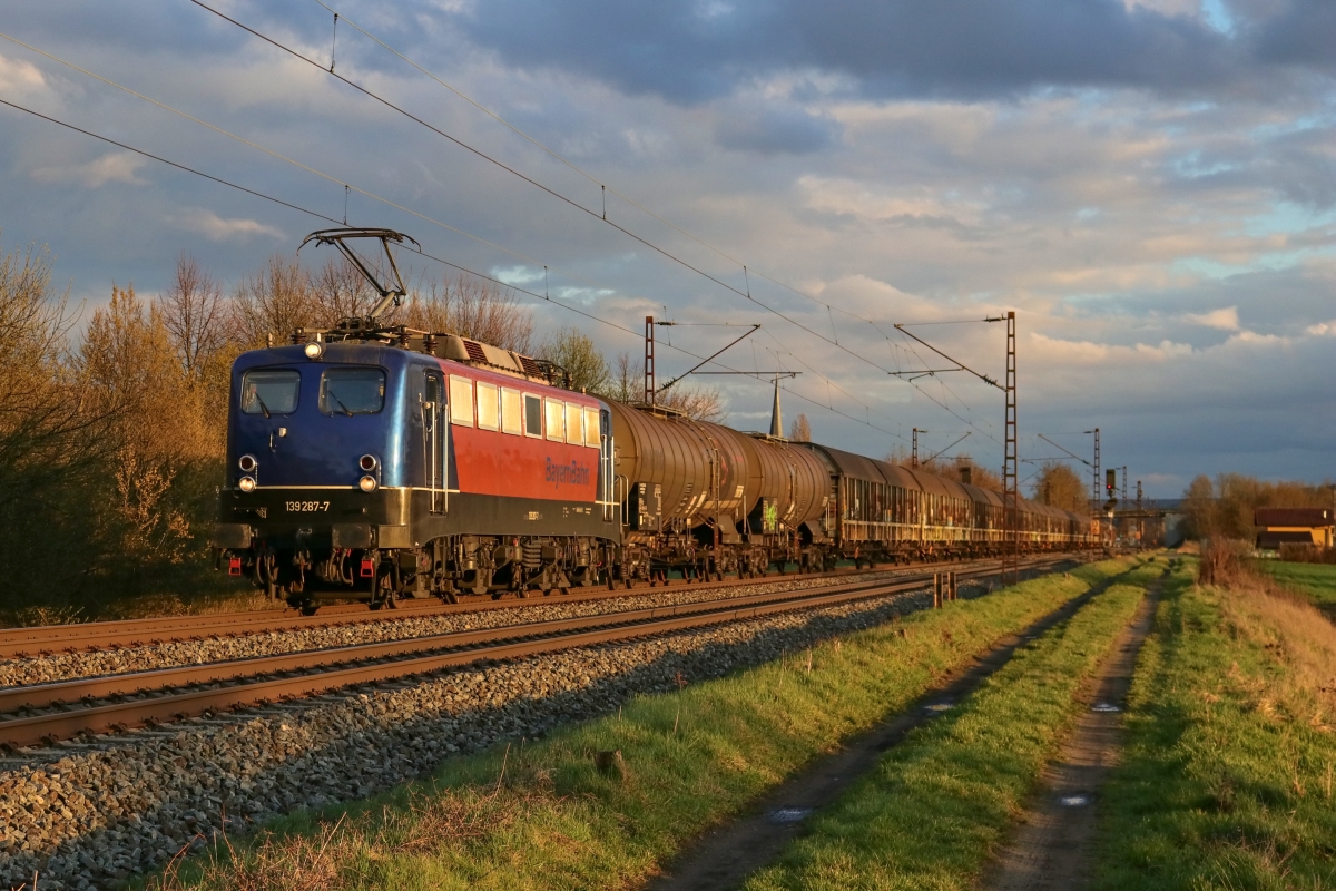 Dto. 139 287-7 am 06.04.2018 bei Harrbach im Maintal mit dem Henkelzug in Gegenrichtung