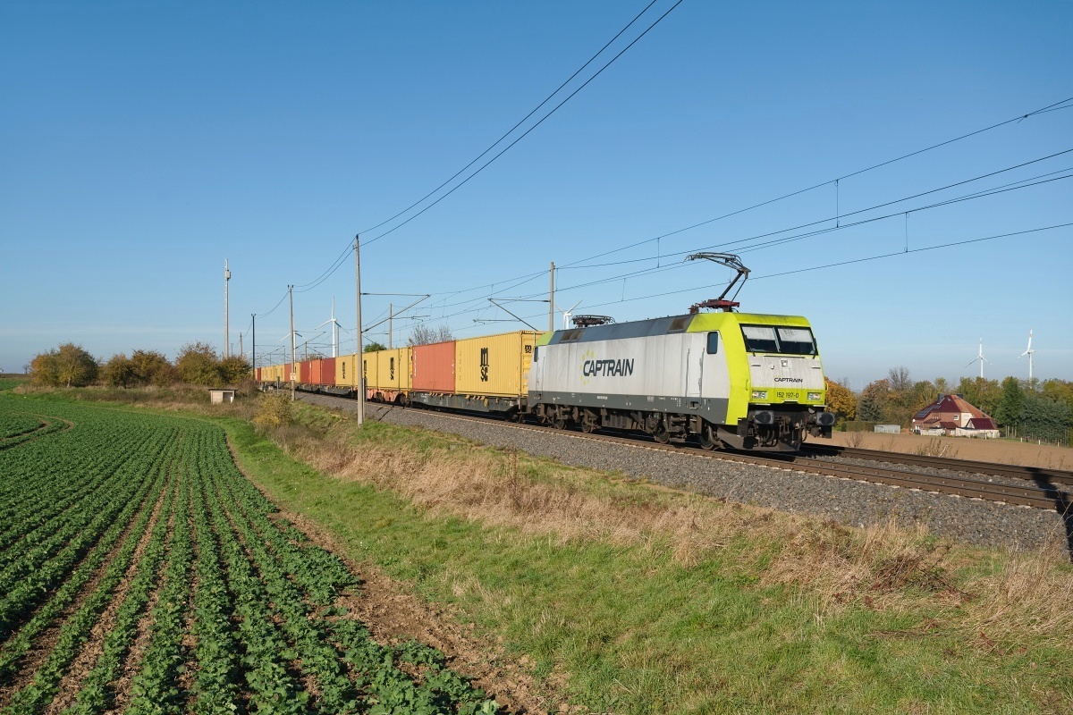 Dto. 152 197-0 am 23.10.2024 bei Ovelgünne (LOV) mit einem CT-Zug Rtg.