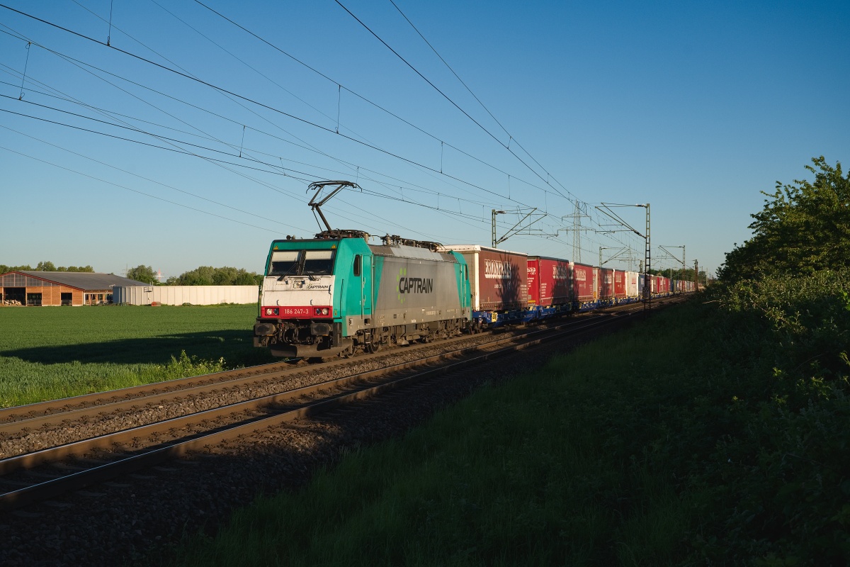 Dto. 186 155-8 im Abendlicht am 17.03.2025 bei Ovelgünne (LOV) mit einem