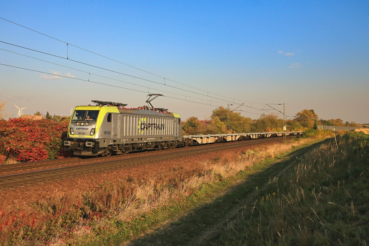 Dto. 187 013-8 im Abendlicht am 16.10.2018 bei Zeithain (DZN) im Bogendreieck. Hier war
