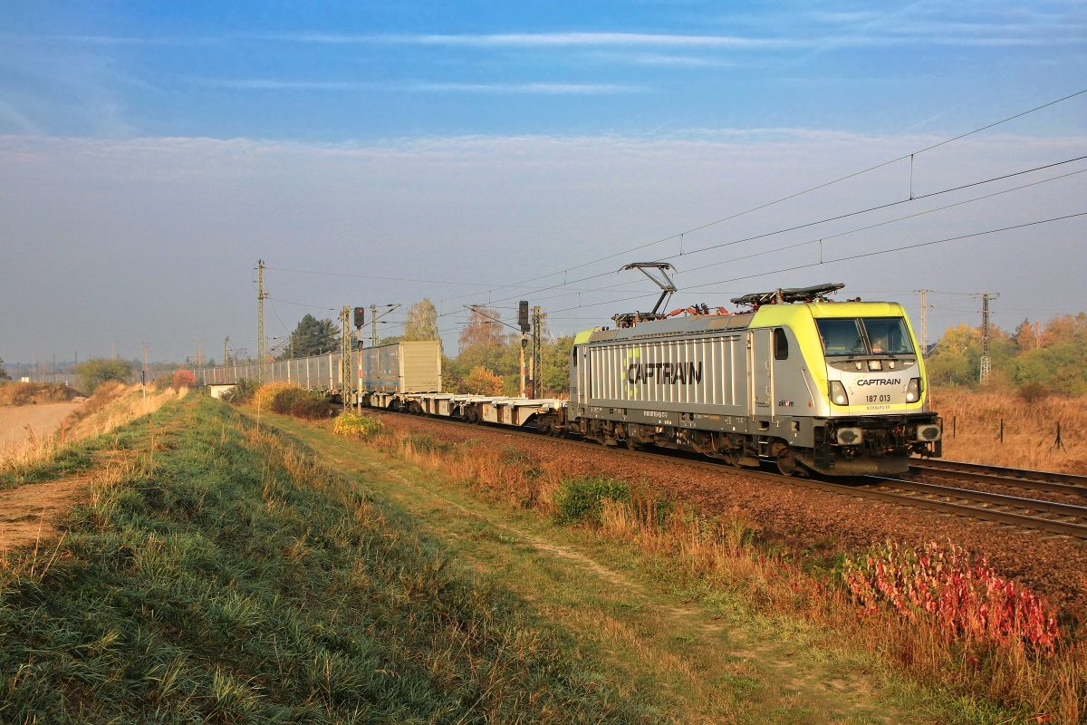 Dto. 187 013-8 dann früh morgens am 18.10.2018 auch bei Zeithain mit demselben Zug in