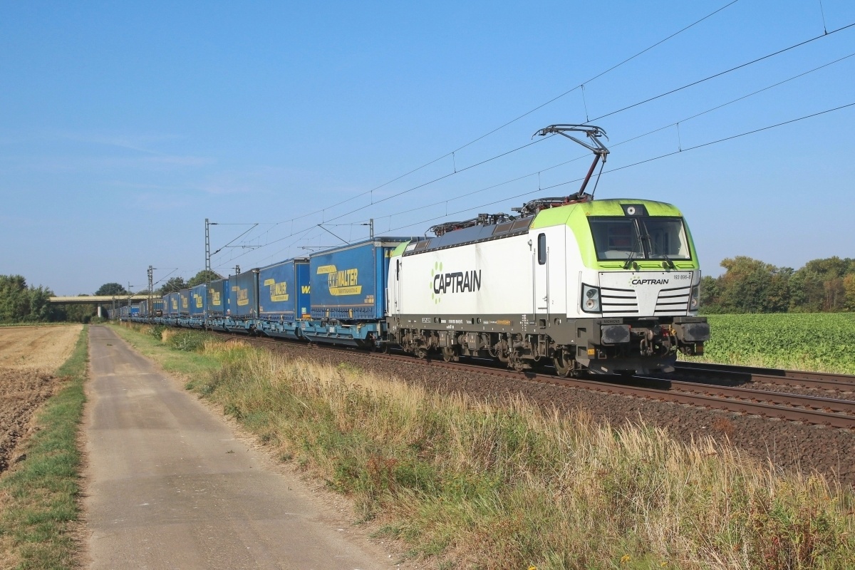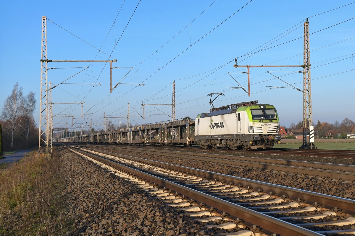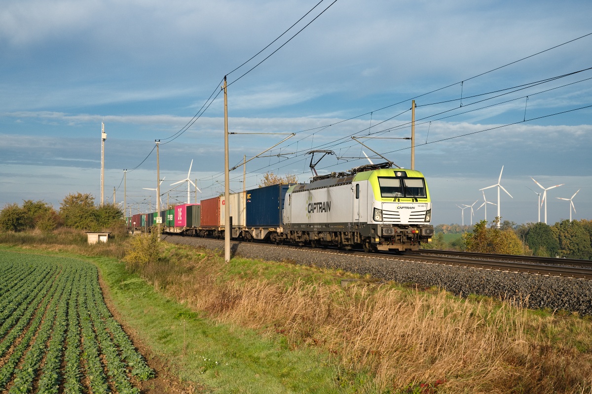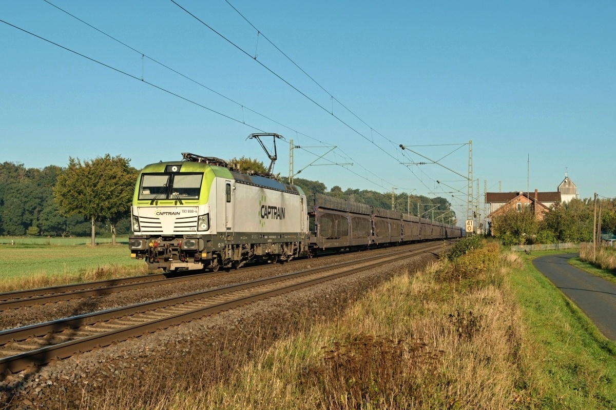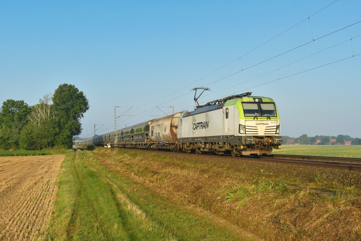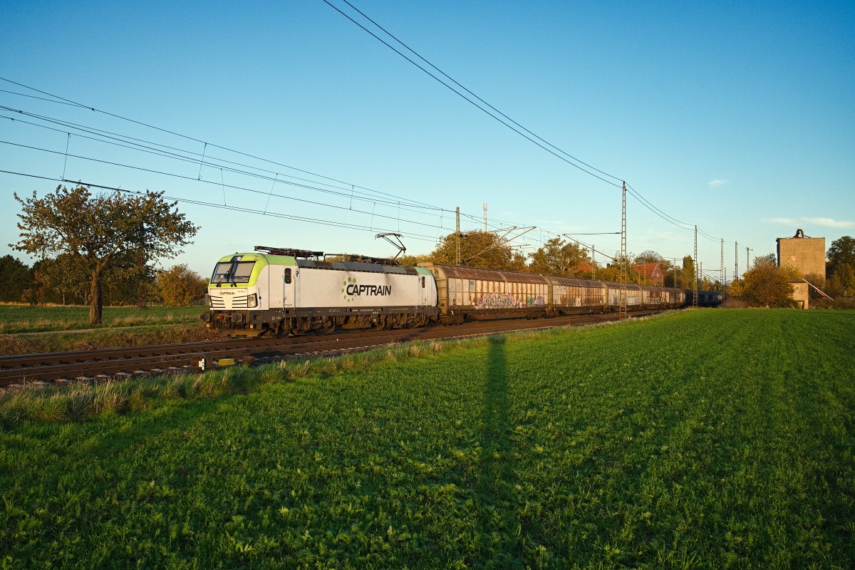 Dto. 193 897-6 am 20.09.2024 von der anderen Lokomotivseite früh morgens bei Ovelgünne (LOV) mit einem