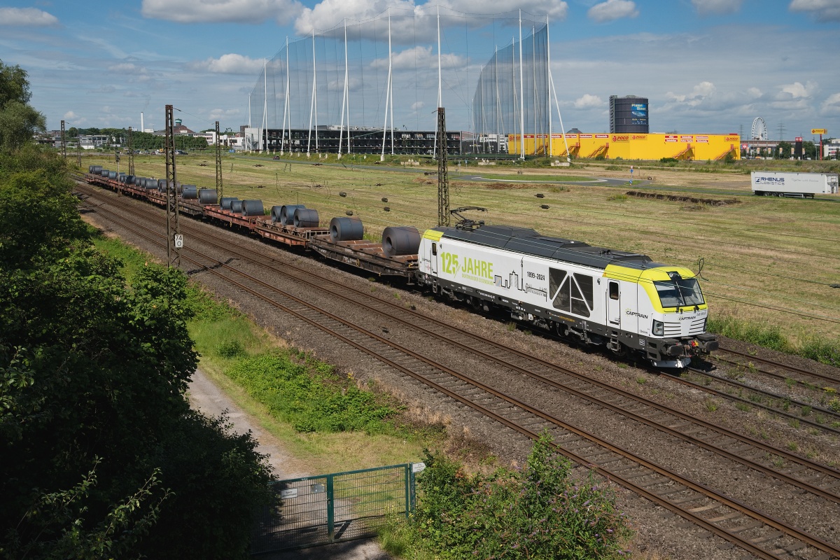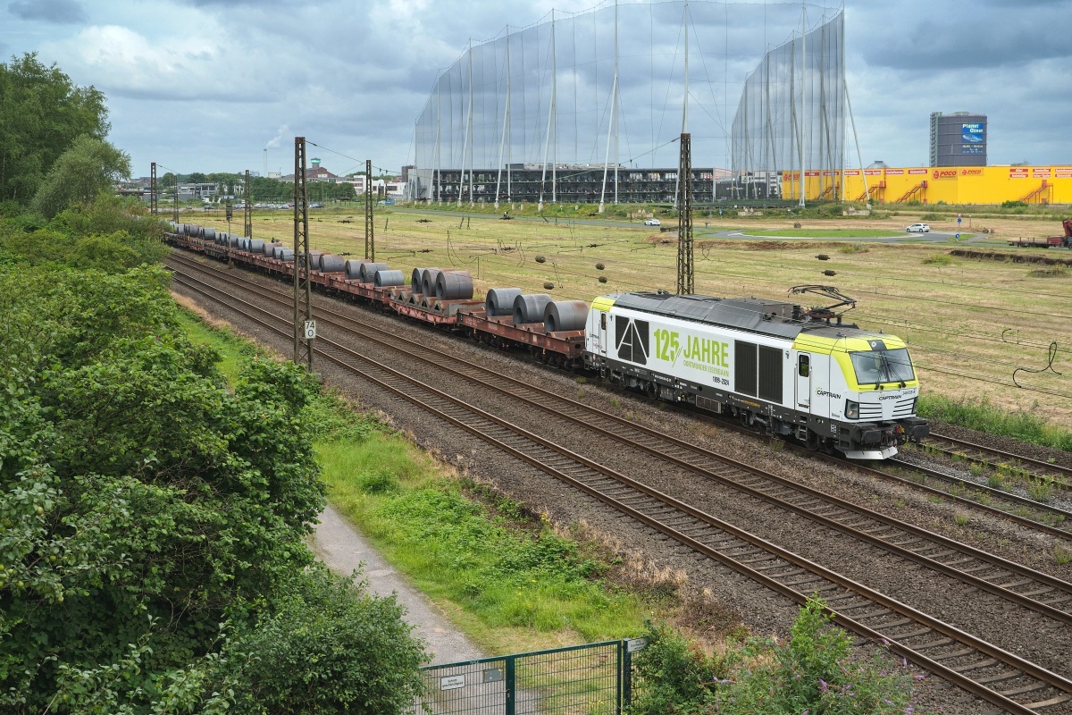 hier am 05.07.2024 bei Essen-Dellwig (EEDL) mit einem Stahlzug Rtg.