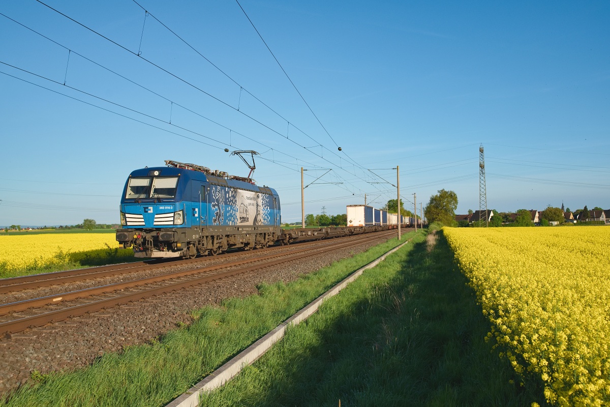 Dto. 383 022-1 am 21.03.2025 bei Wierthe (HWIR) mit dem Lovosice KLV DGS