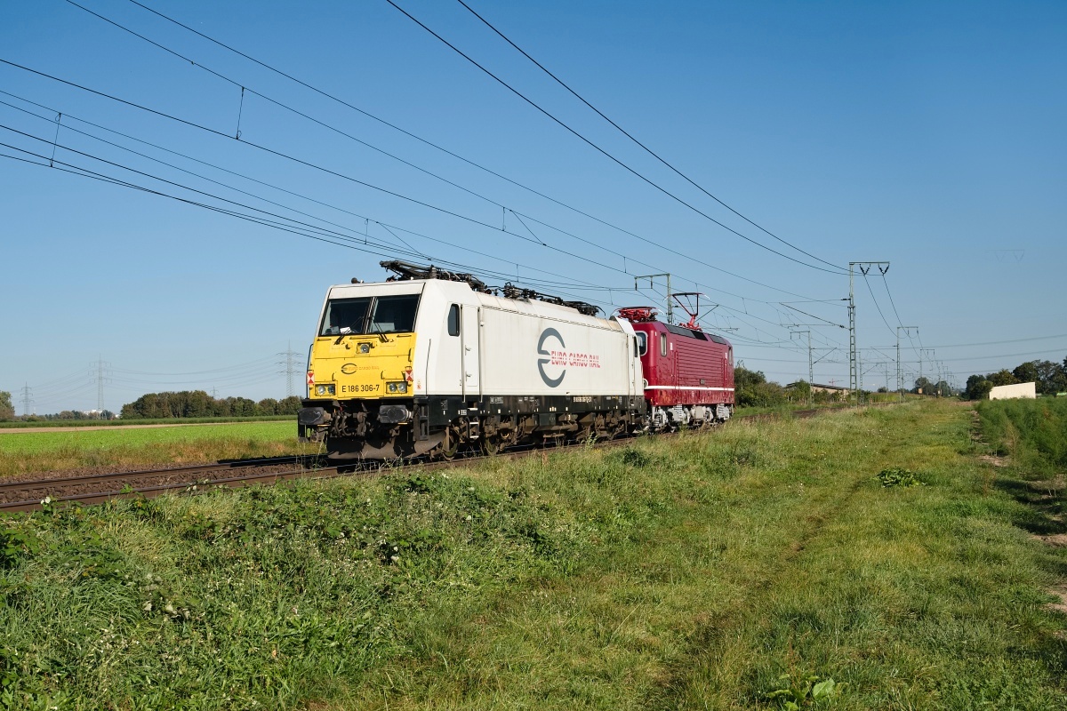 zieht hier am 26.09.2023 bei Klein-Gerau (FKGE) die Wagenlok 186 306-7