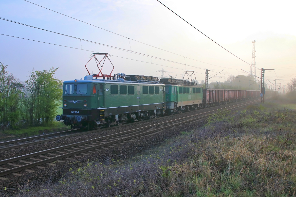 Dto. 142 118-9 am 06.04.2019 im Morgennebel und im Gegenlicht. Hier