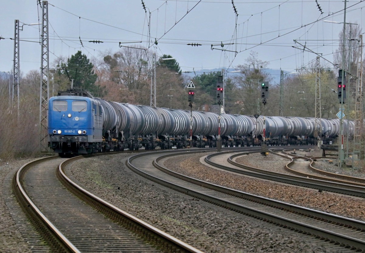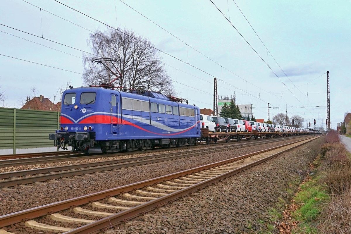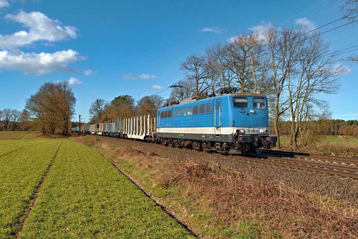 Dto. 151 033-8 am 17.03.2017. Die Lok passierte hier den Bahnhof Lindhorst (HLH) mit voll beladenen Ars-Altmann