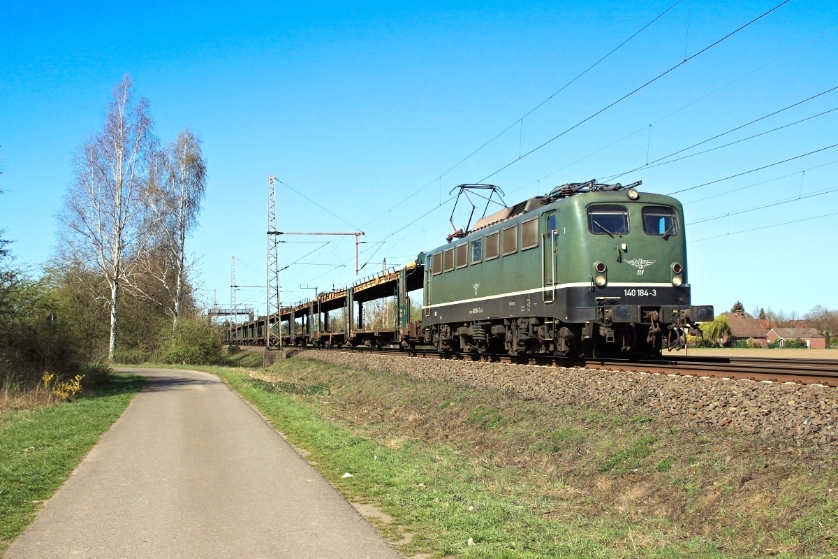 140 184-3 D-ELV) durchfuhr hier am 20.04.2016 Nienburg mit einem STVA Autotransportleerzug Rtg. Hannover.