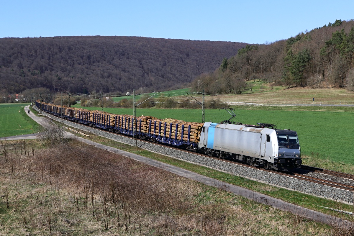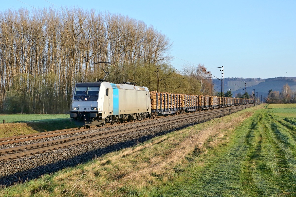 Dto. 185 694-8 am 06.04.2018. Die Lok war hier bei Harrbach im Maintal mit einem Holzzug Rtg. Süden