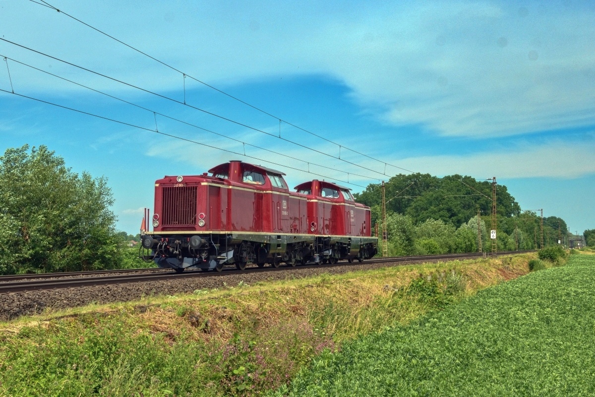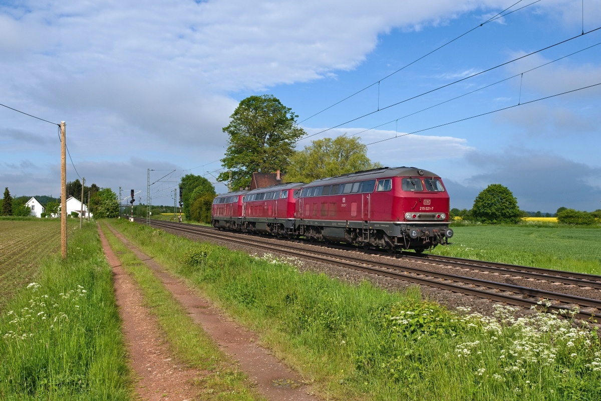 Dto. 218 455-4 als Triple am 25.05.2021 bei Stadthagen (HSHG) Probsthagen im Nachschuss mit 215 017-5 und 215 021-7 in Rtg. Westen/Minden